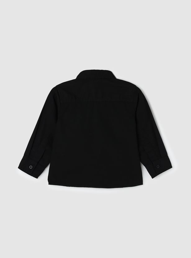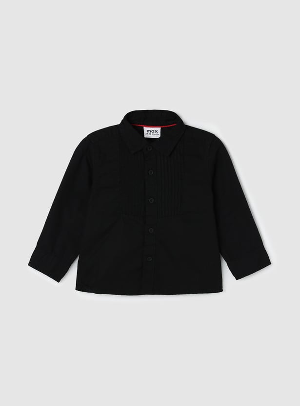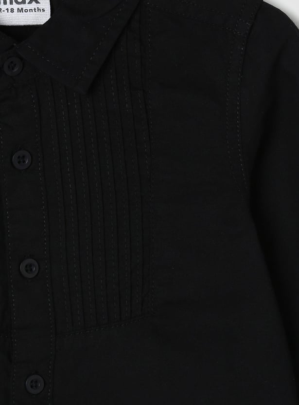 Spruce up his outfit with this shirt tailored with a spread collar, long sleeves, buttoned cuffs, pintuck detailing at the yoke, and a regular hem.