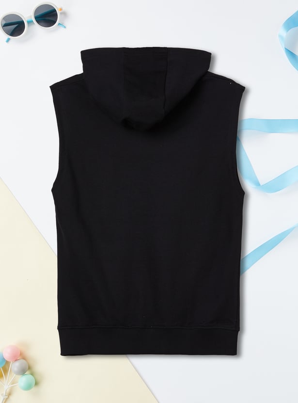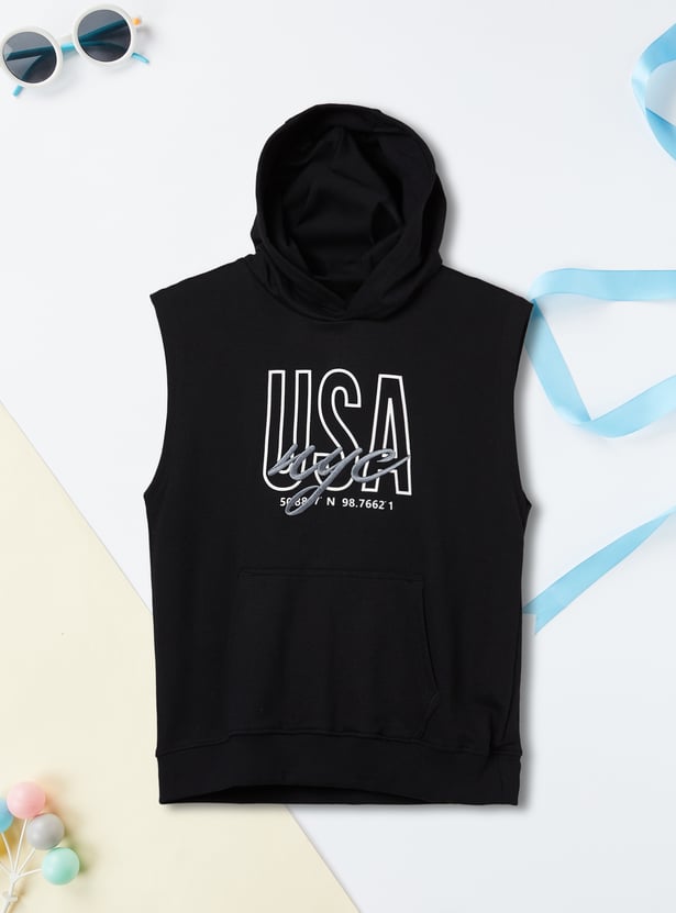 This sleeveless hoodie T-shirt for boys features a bold USA chest print with embroidered detailing, adding a trendy touch. The hooded design and ribbed hem provide a comfortable fit. Perfect for casual outings, it combines style and comfort effortlessly.