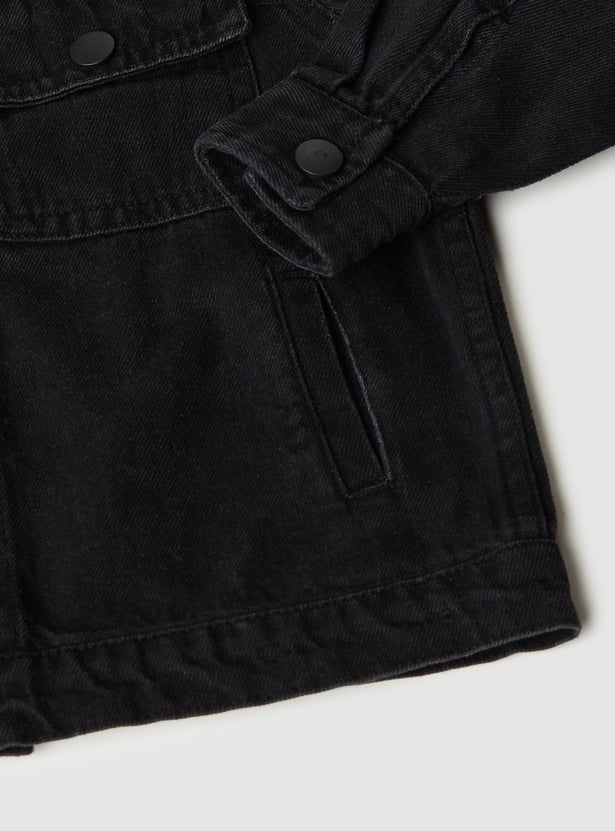 This rinsed denim jacket features a spread collar and button closure for a classic, stylish look. With full sleeves and flap pockets, it offers both functionality and comfort, making it a versatile addition to any casual outfit.