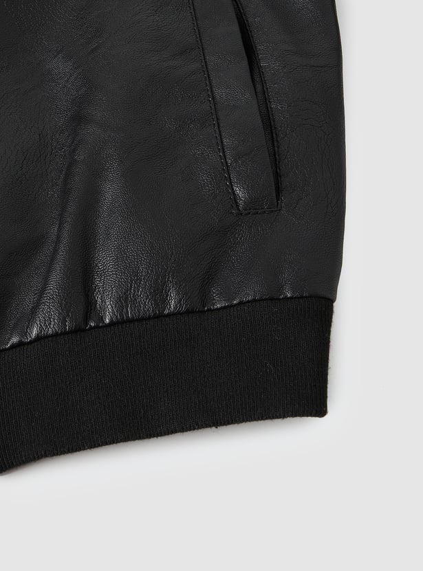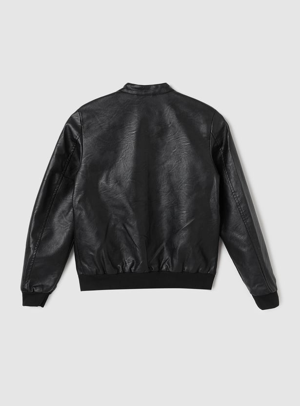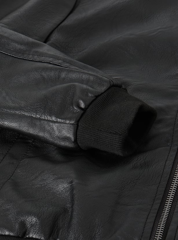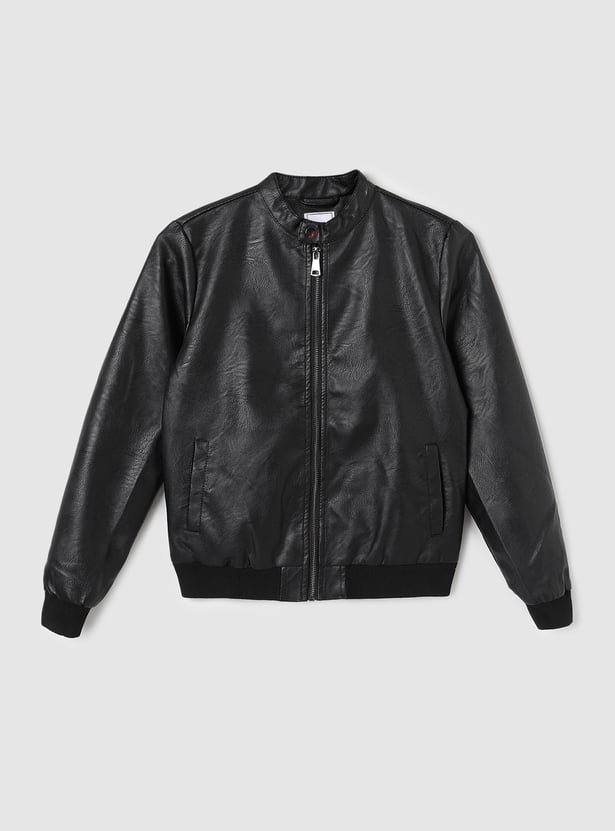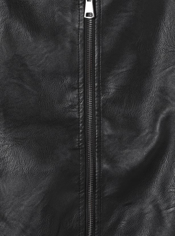 This biker jacket combines edgy style with comfort. Featuring a sleek band collar, ribbed trim, and functional waist pockets, it is perfect for cooler days. Its solid tone finish adds a cool, casual vibe to any outfit.