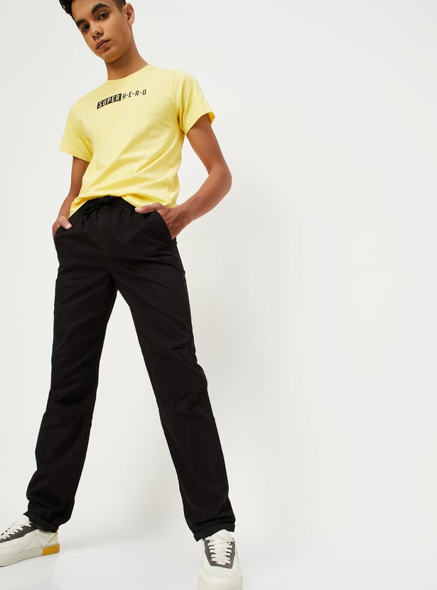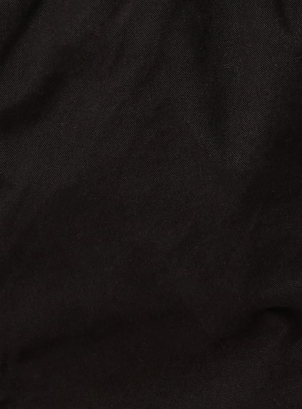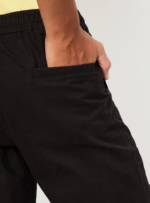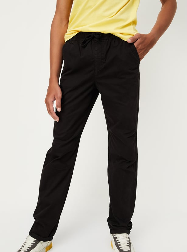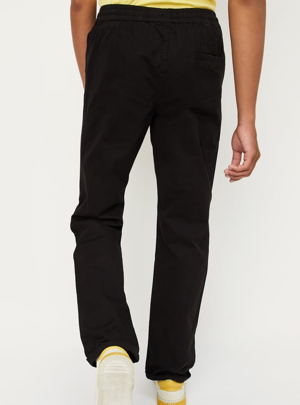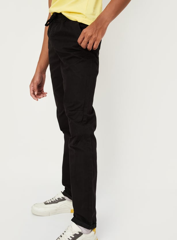 Style meets comfort with this pair of trousers. It has a solid tone finish. This pair has cross pockets and a back patch pocket. The drawstring waist gives a custom fit.