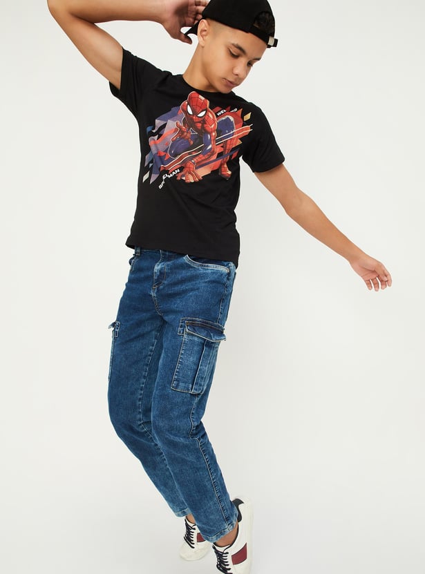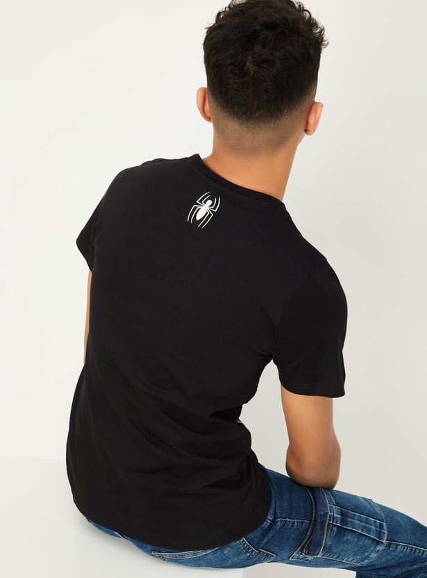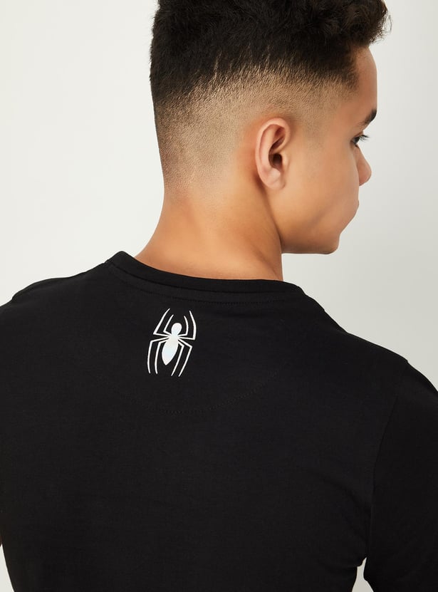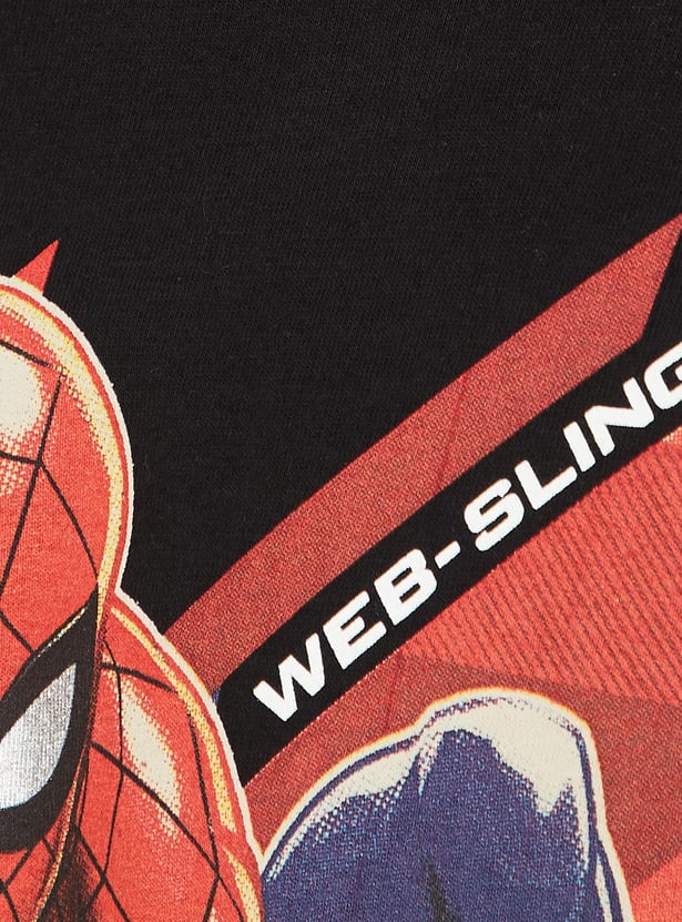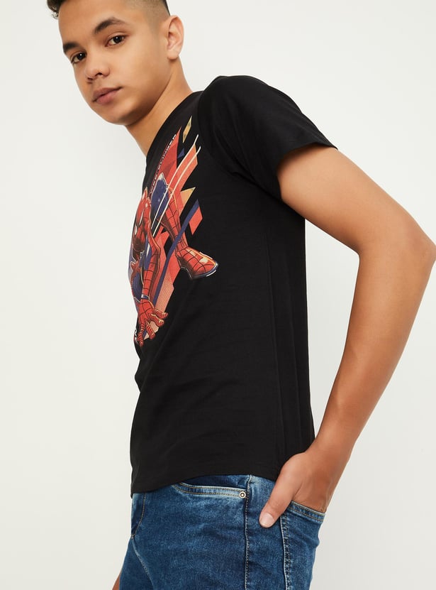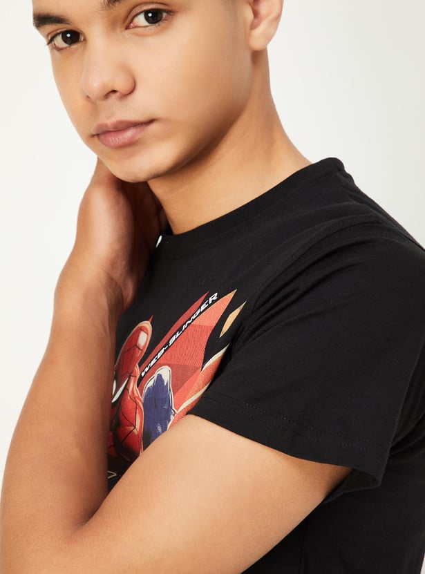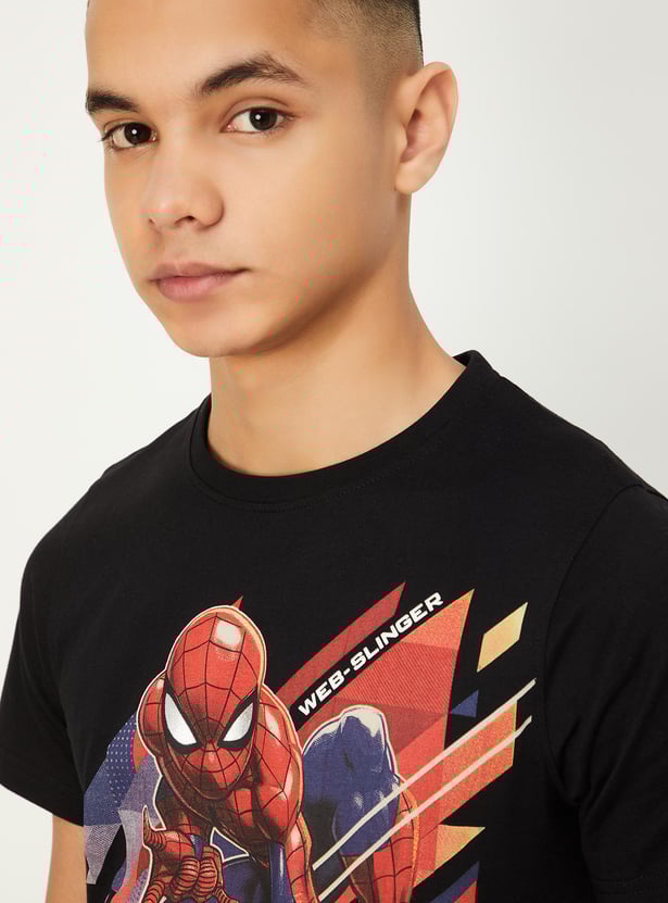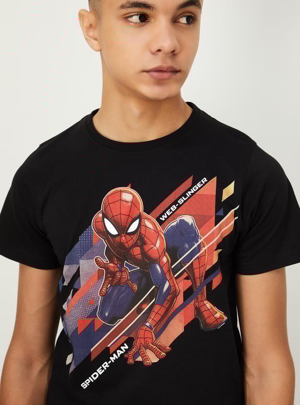 Add a fun twist to your kid's casual wardrobe with this T-shirt. It is styled with a Spiderman print, a crew neck, and short sleeves.