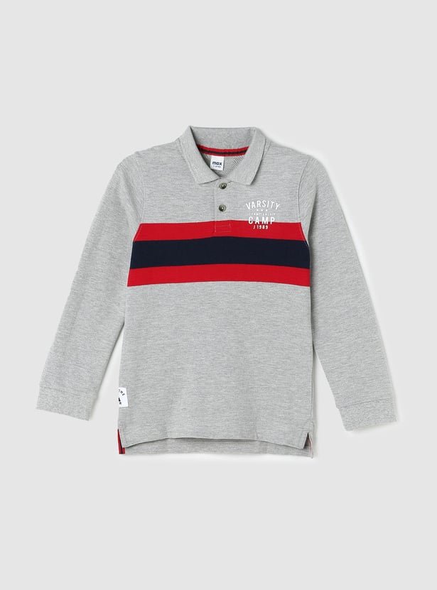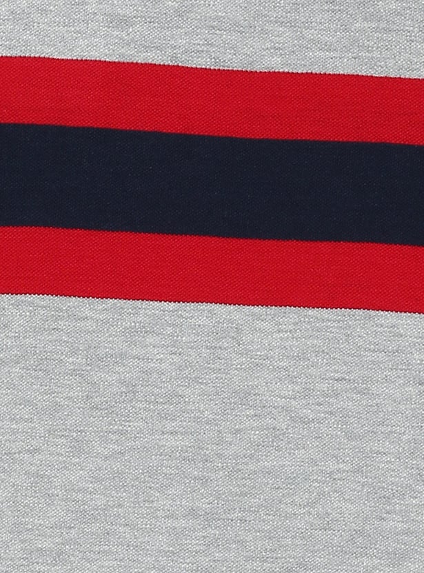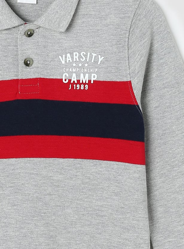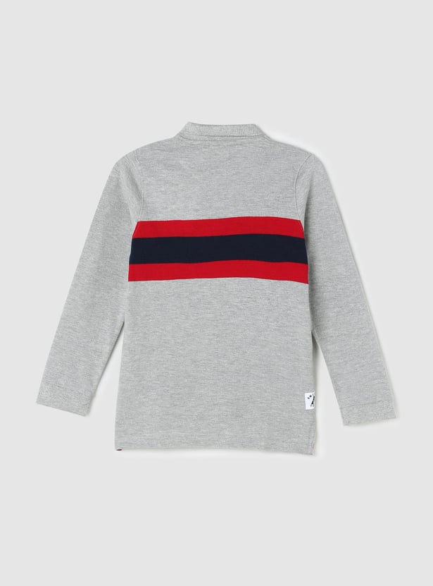 Spruce up his everyday style with T-shirt. It is updated with a striped pattern at the chest, a polo collar, long sleeves, a button placket, and a step hem.