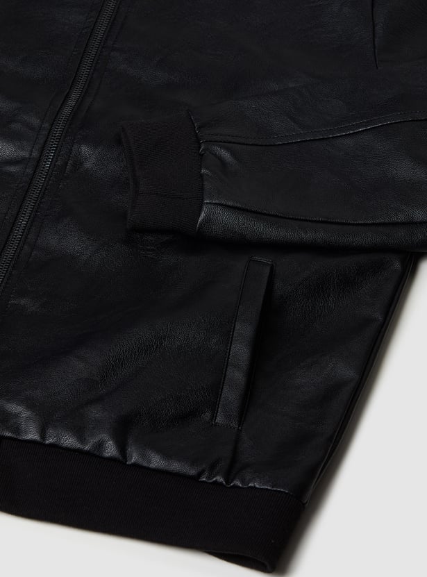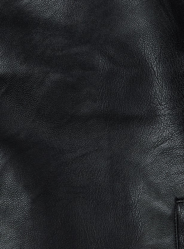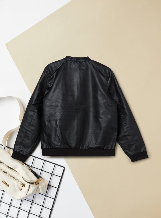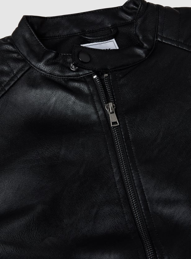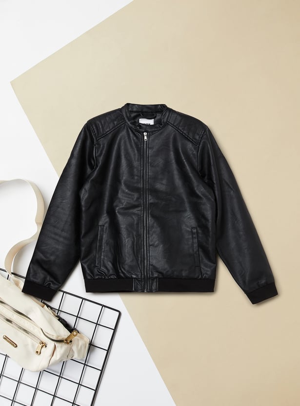 A sleek, textured biker jacket featuring a band collar, full sleeves, a zip closure, and functional pockets. Designed for edgy style with everyday utility, it’s a versatile staple for modern wardrobes.