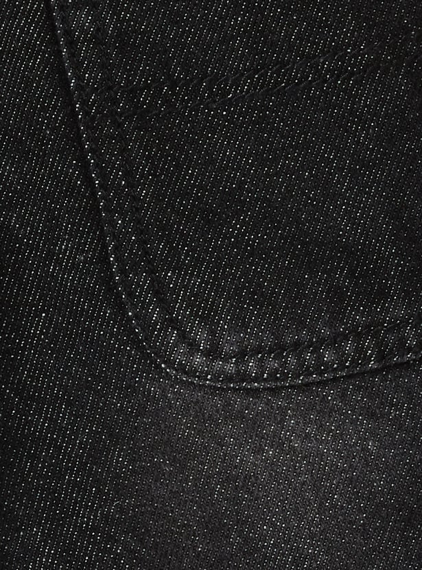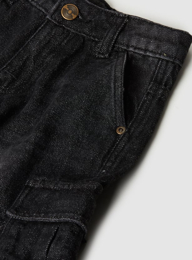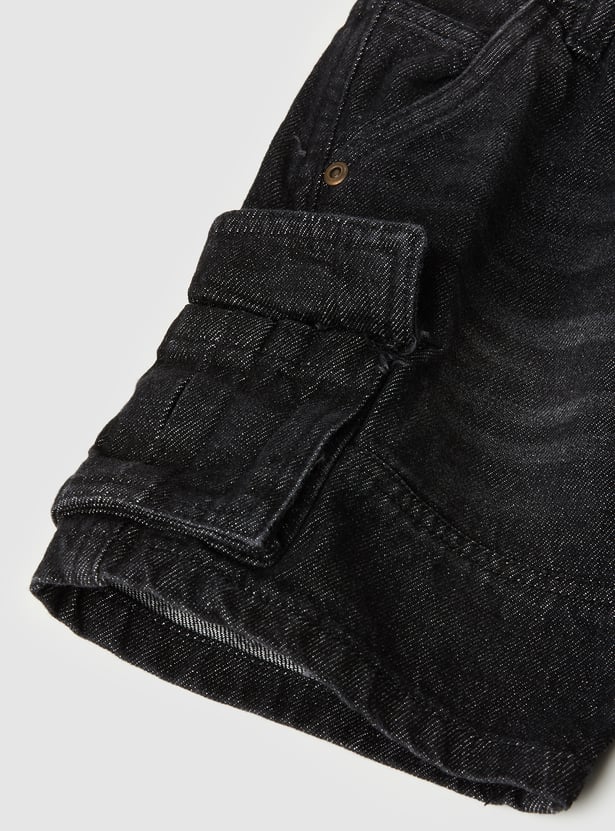 These washed denim cargo jorts feature a button closure and belt loops for a secure and adjustable fit. With spacious cargo pockets for added functionality, they offer a stylish yet practical option for casual wear, perfect for warm-weather days.