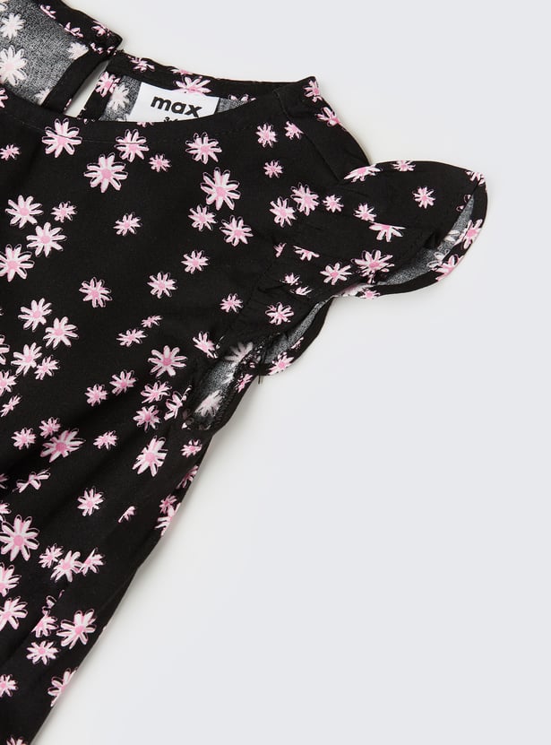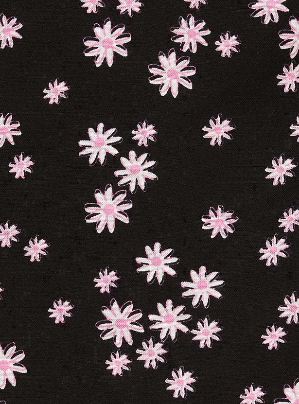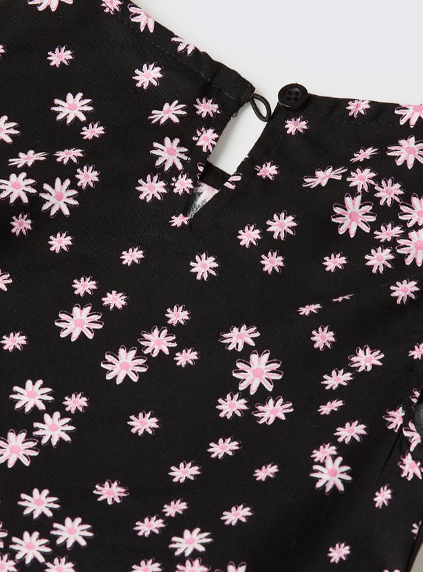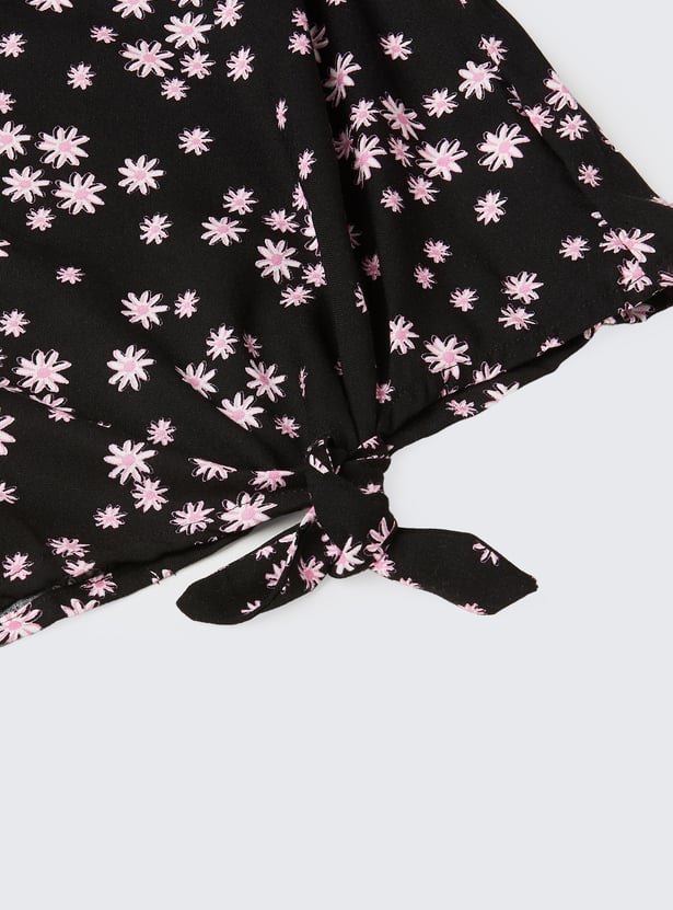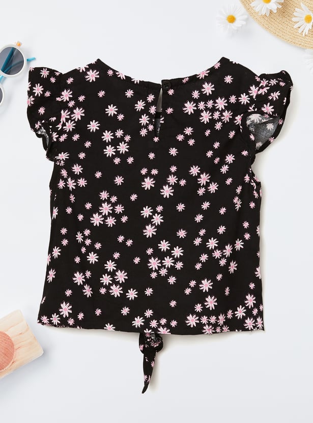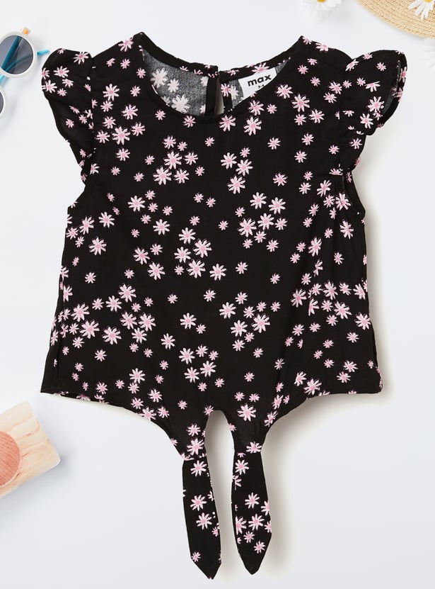 This all-over print top is a little burst of sunshine. With a round neck, cap sleeves, and a button closure, plus a sweet tie-up hem, it’s perfect for adding a touch of charm to any outfit.