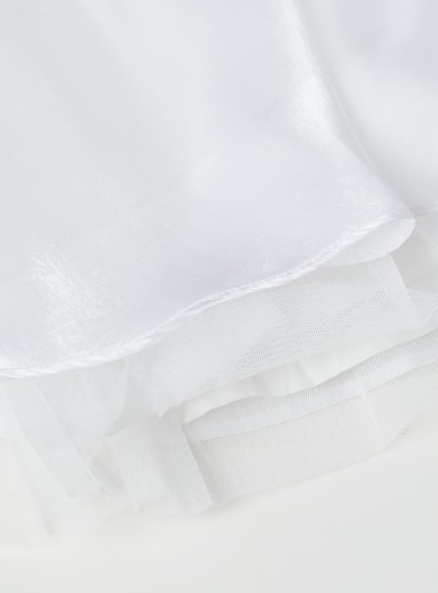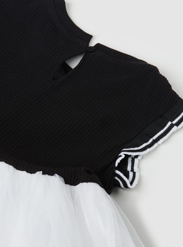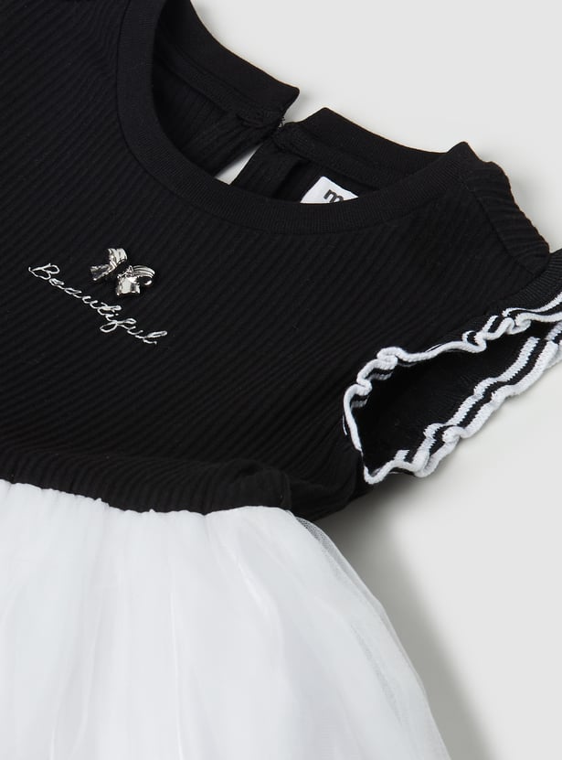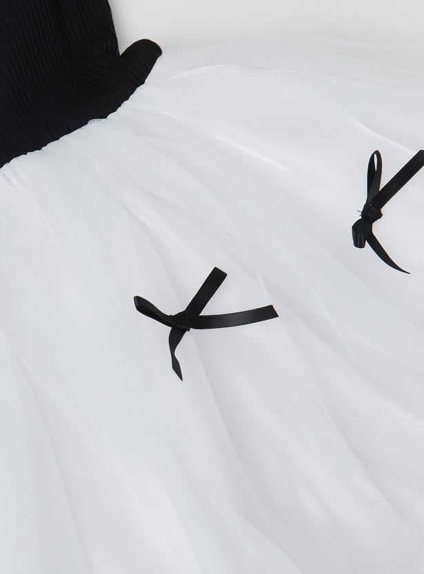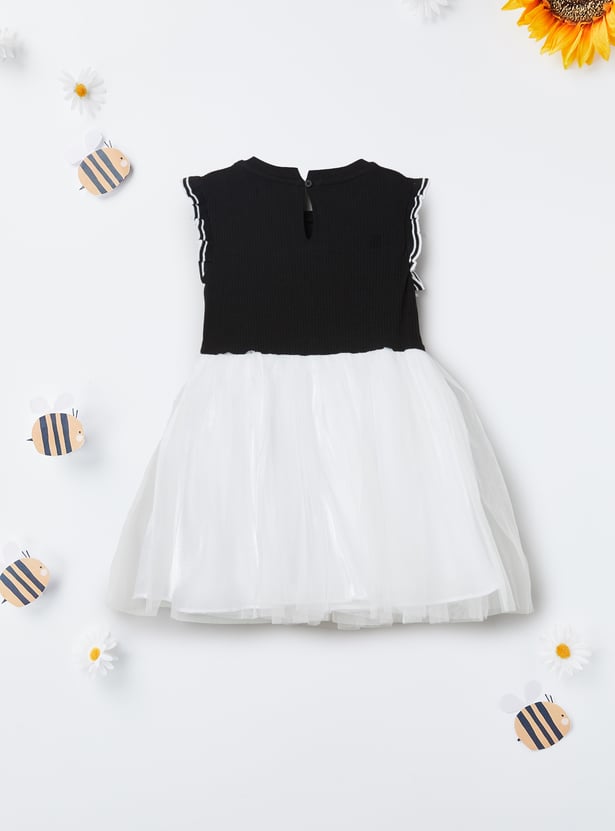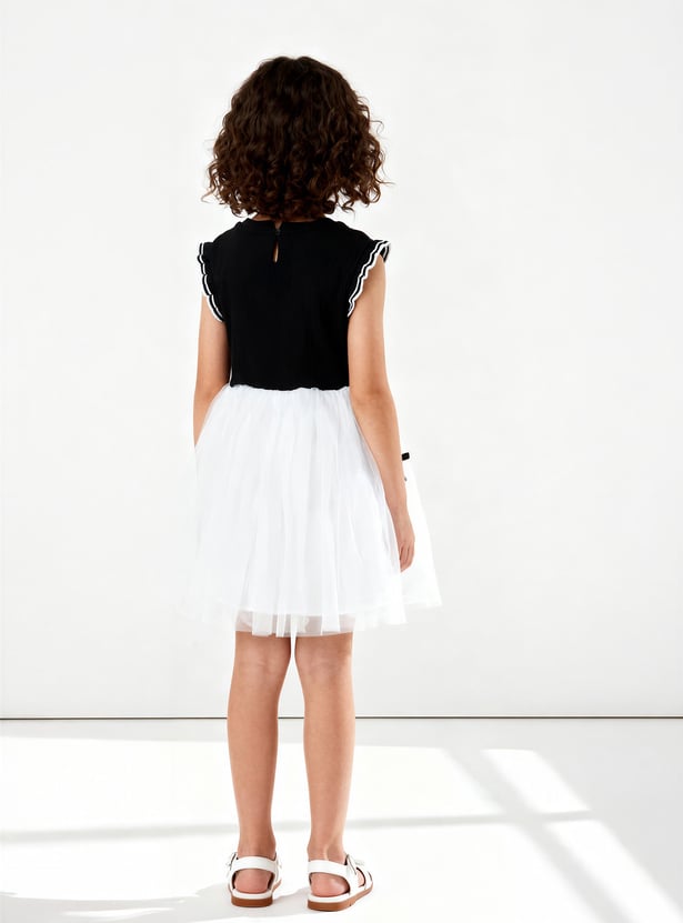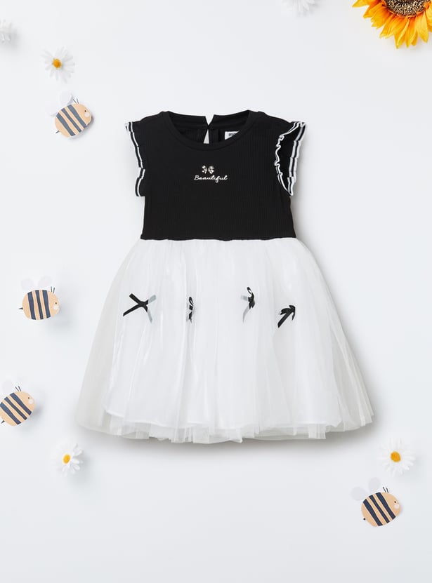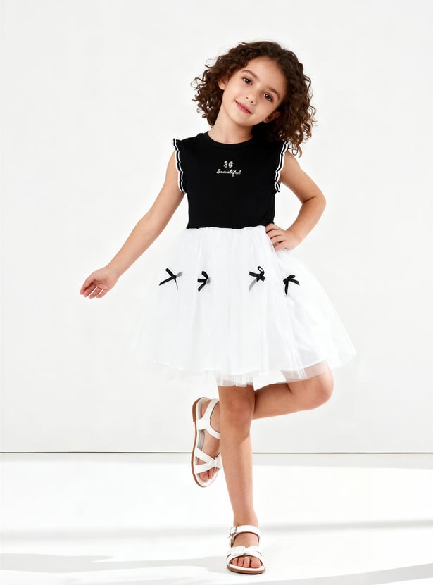 Step into playful elegance with this bow applique dress. Featuring a round neck, sleeveless design, button closure, and a flared hem, it offers a charming and flattering silhouette