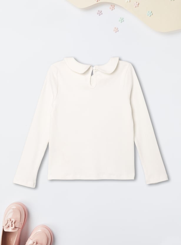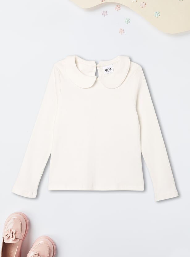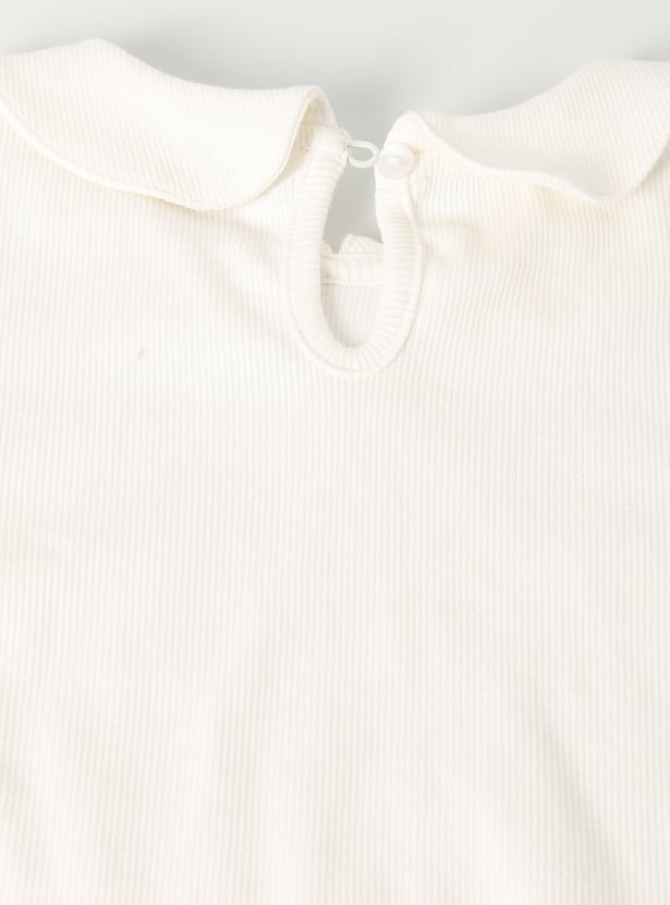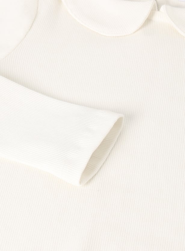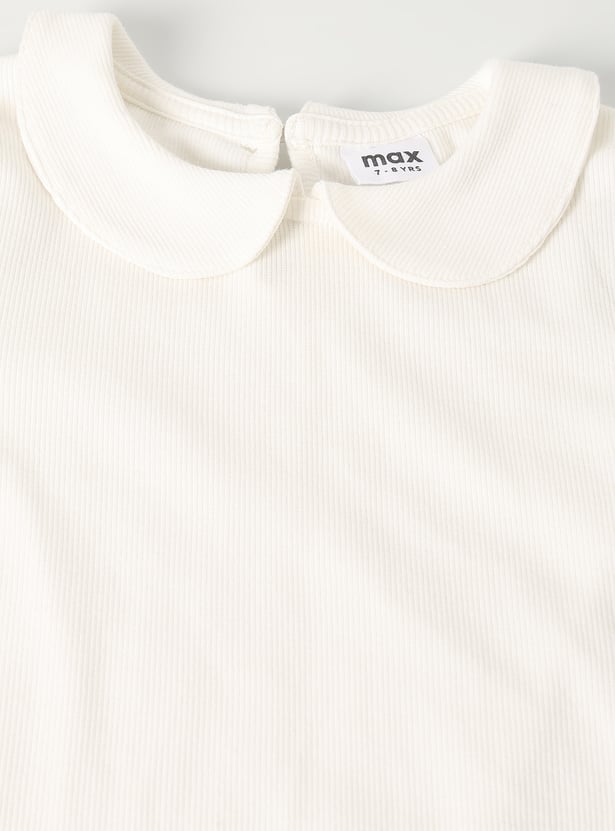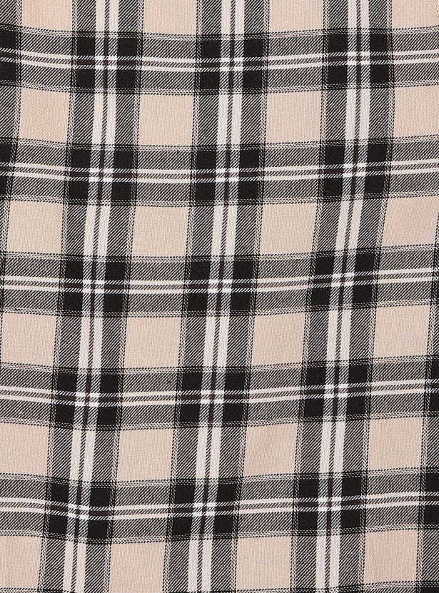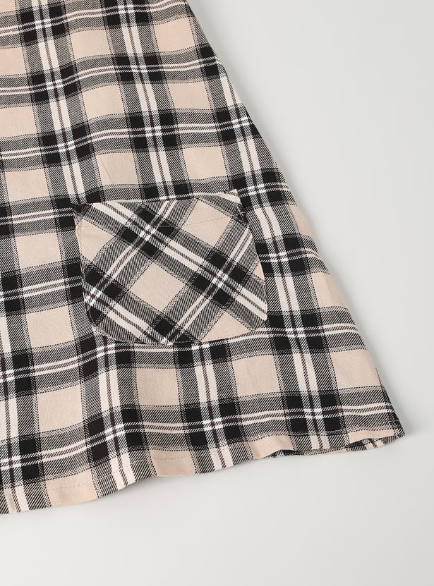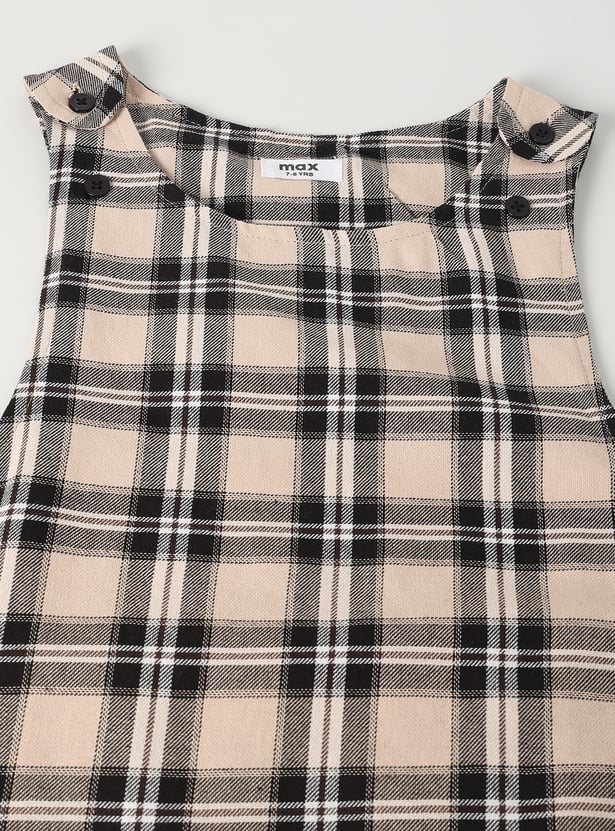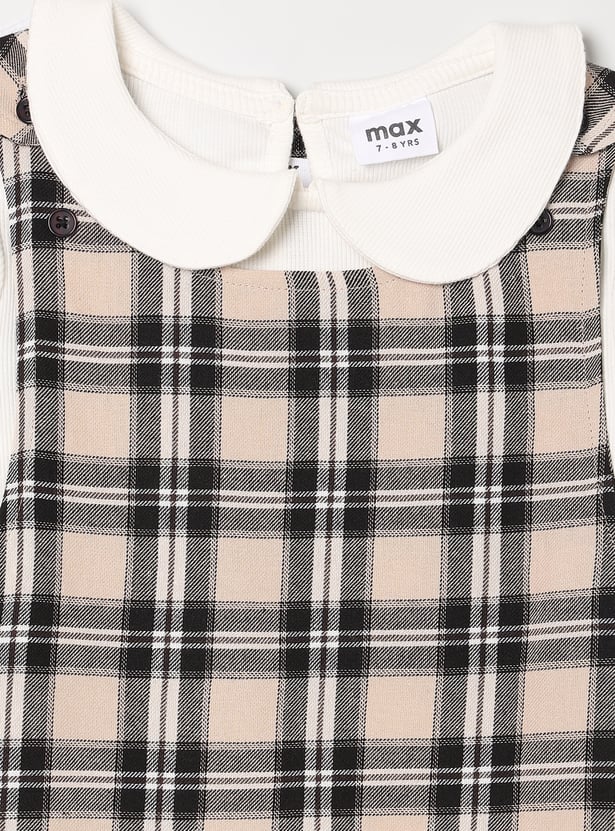 This girls checked dungaree dress set is a sweet and classic ensemble. The sleeveless, knee-length dungaree features a timeless check pattern, paired with a solid full-sleeve top with a round collar for a polished finish.
