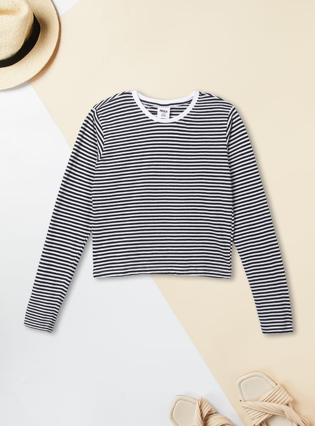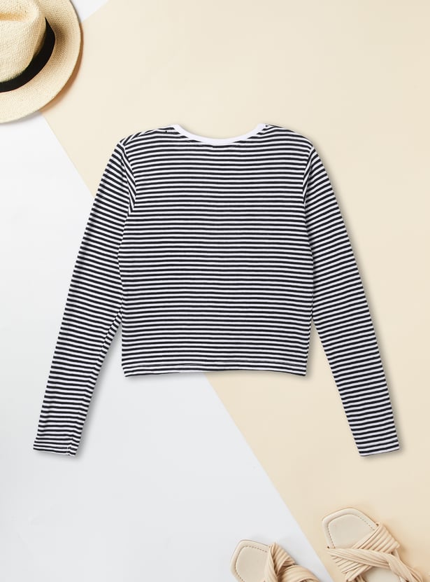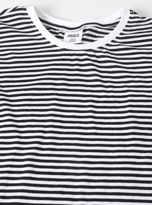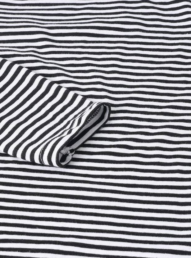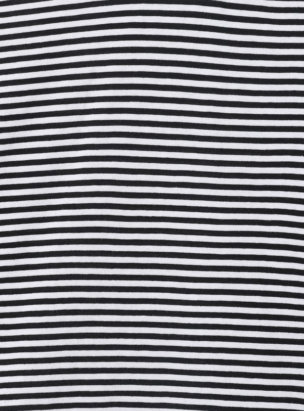 This girls’ solid denim pinafore dress set features a classic dungaree-style dress with adjustable straps, a front pocket, and button closures. It’s paired with a striped full-sleeve round neck T-shirt for a cute and timeless layered look.