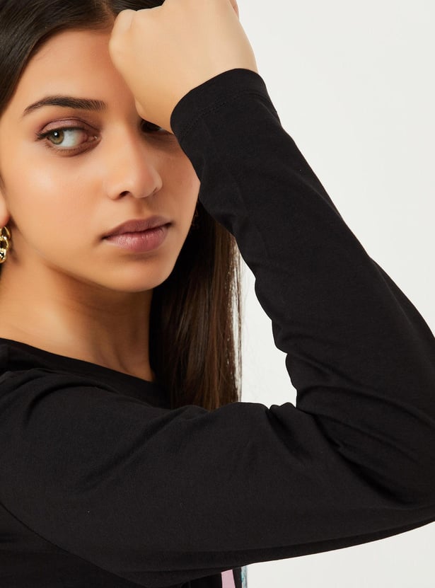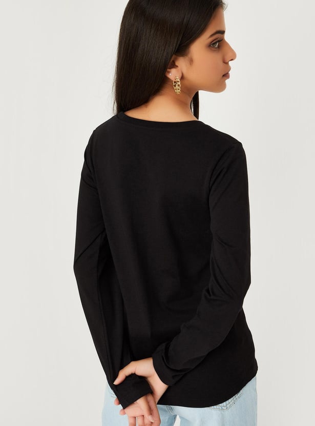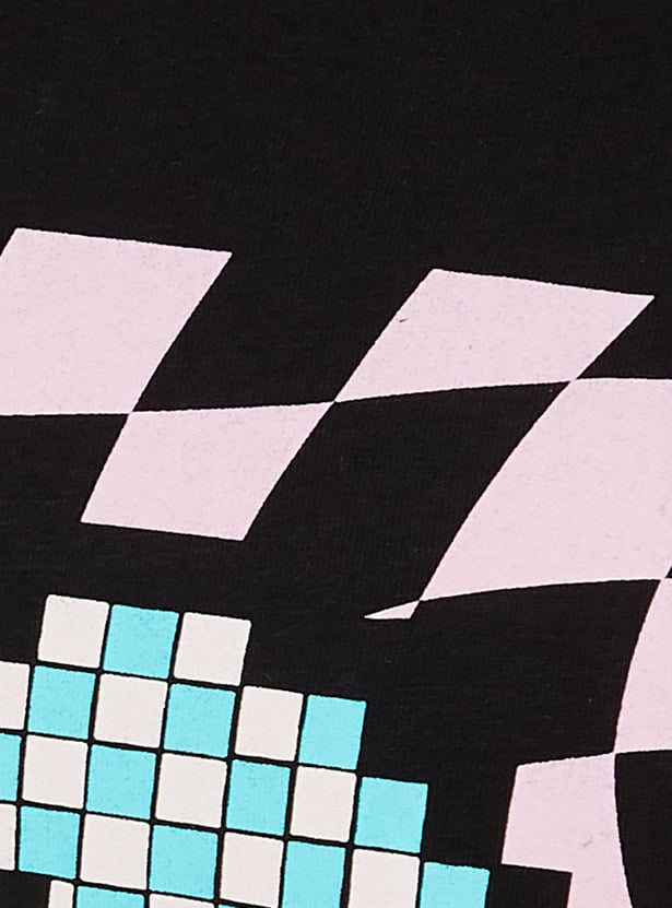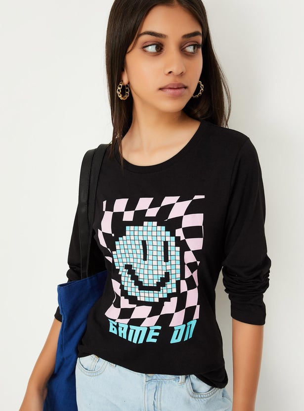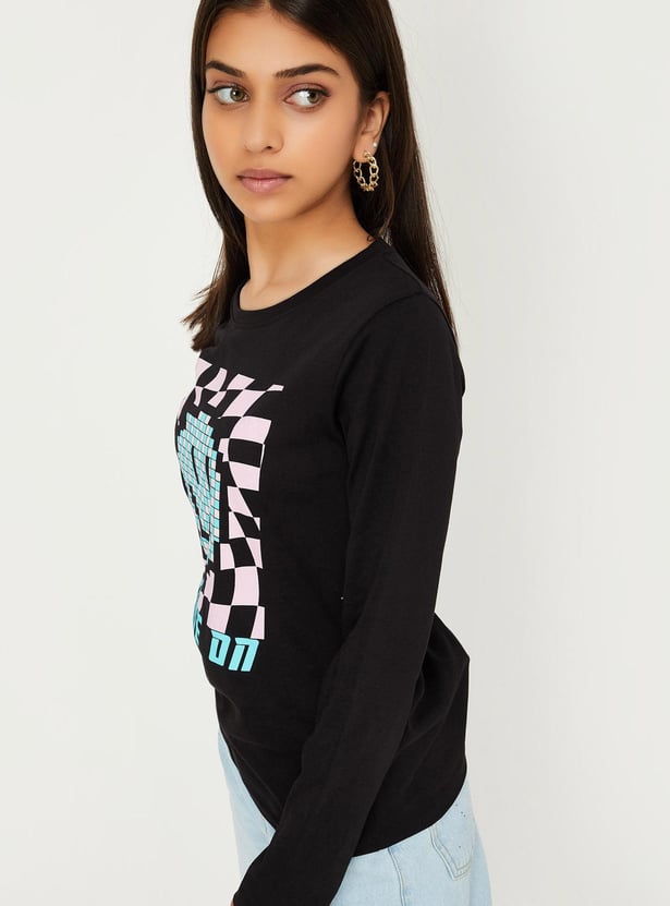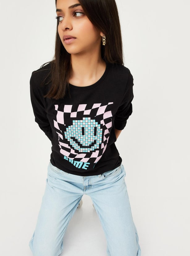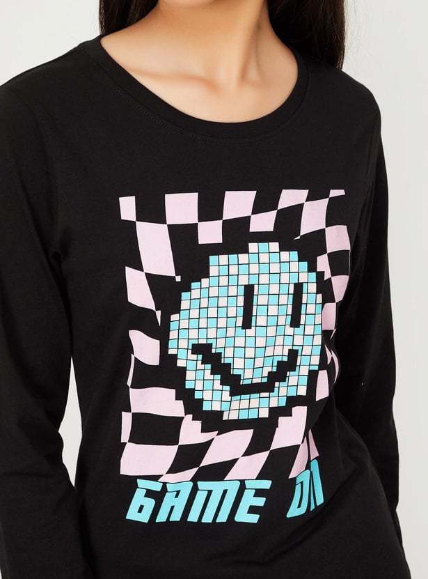 Add a fun twist to your kid's casual wardrobe with this T-shirt. It is styled with a graphic print, a round neck, and full sleeves. Style this tee with jeans and sneakers to nail the look.