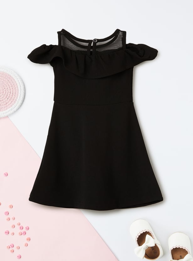 Let her shine in this dress. Featuring a chic cold shoulder design, this dress adds a modern twist to a classic A-line silhouette. The illusion neck creates a subtle, sophisticated effect, while the ruffled details give it a fun touch. The mesh yoke adds an extra layer of texture and style.