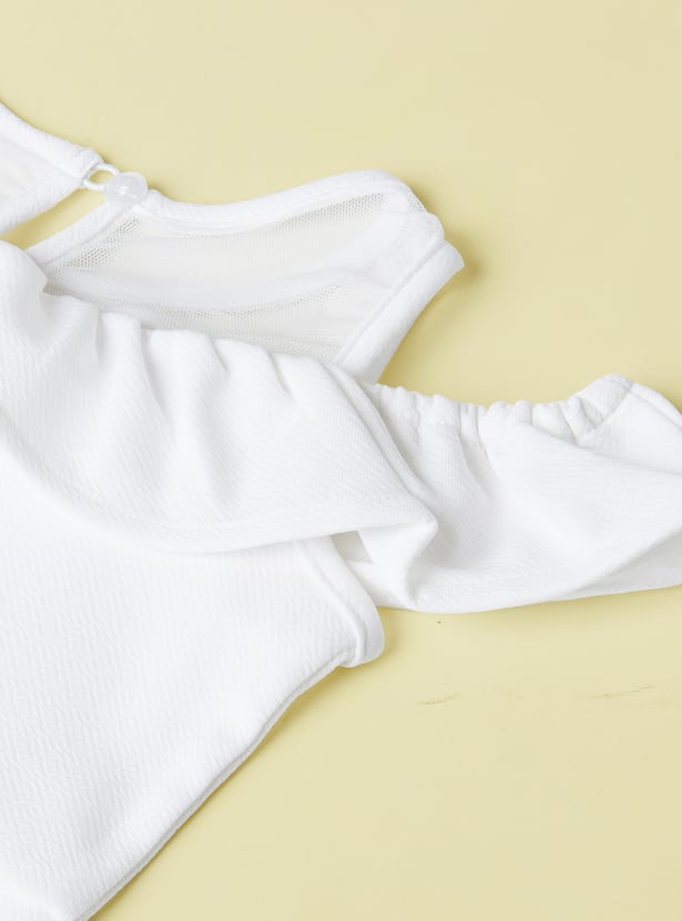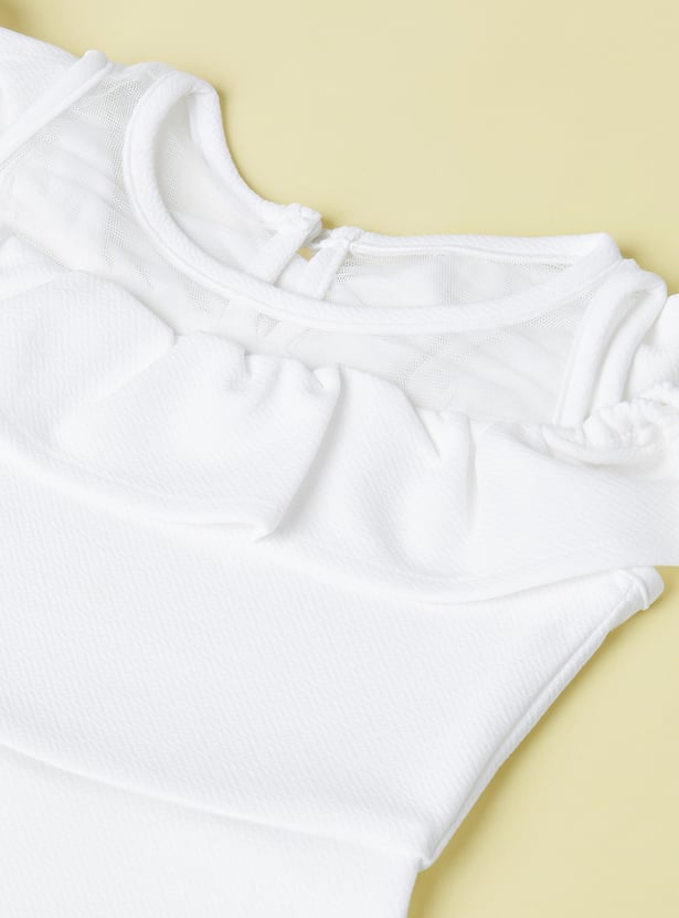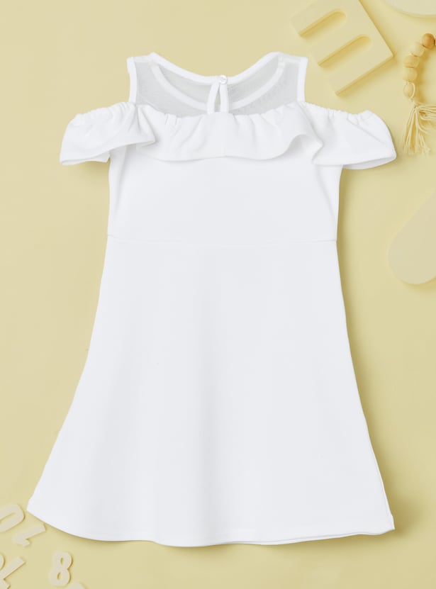 Let her shine in this dress. Featuring a chic cold shoulder design, this dress adds a modern twist to a classic A-line silhouette. The illusion neck creates a subtle, sophisticated effect, while the ruffled details give it a fun touch. The mesh yoke adds an extra layer of texture and style.