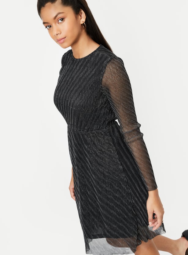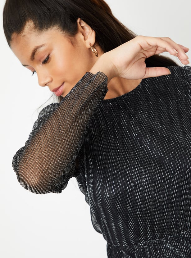 Glam up your little one in this stunning metallic plissé dress, featuring full sleeves and a classic round neck for a sleek, sophisticated look. The pleated fabric adds a touch of elegance, while the metallic finish brings a glamorous shine.