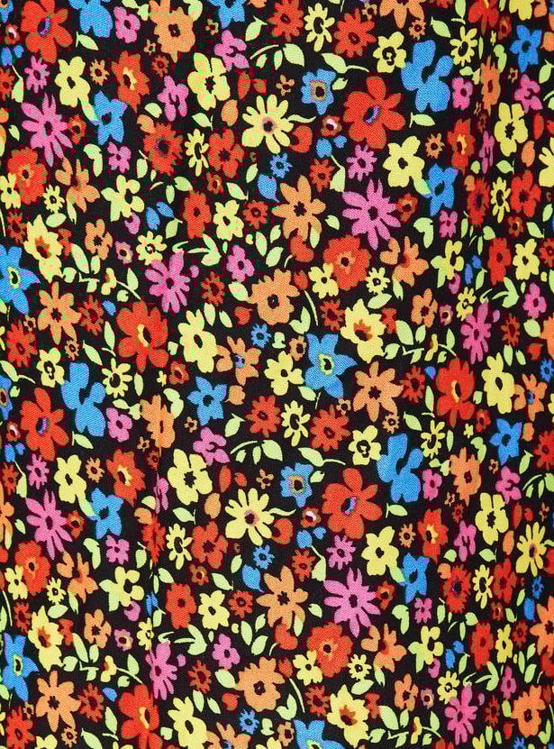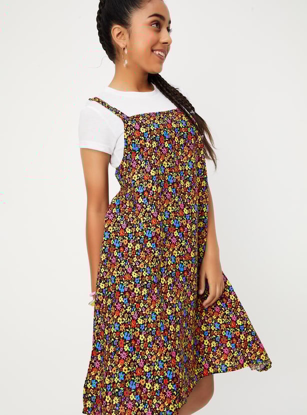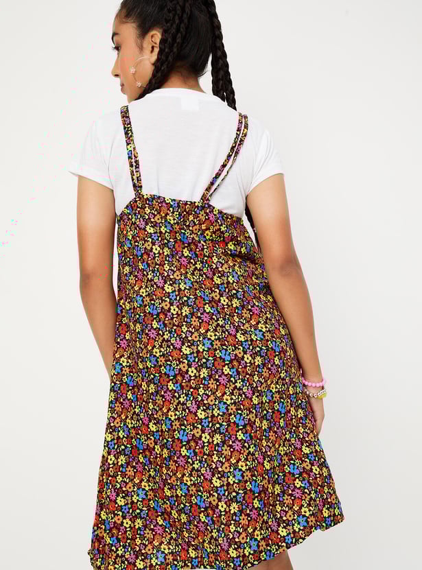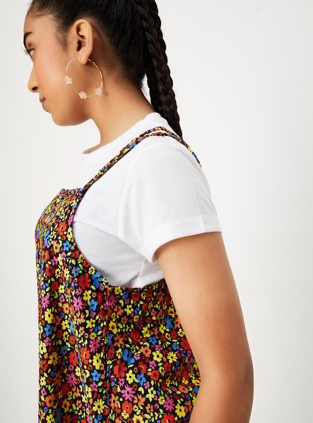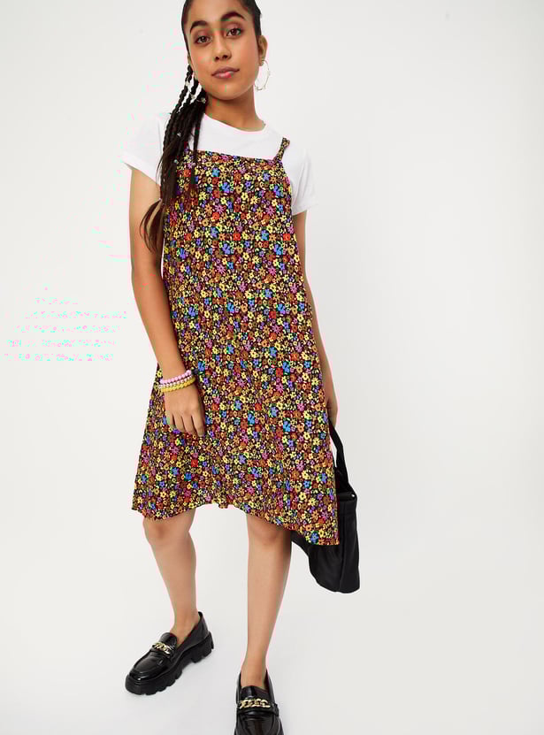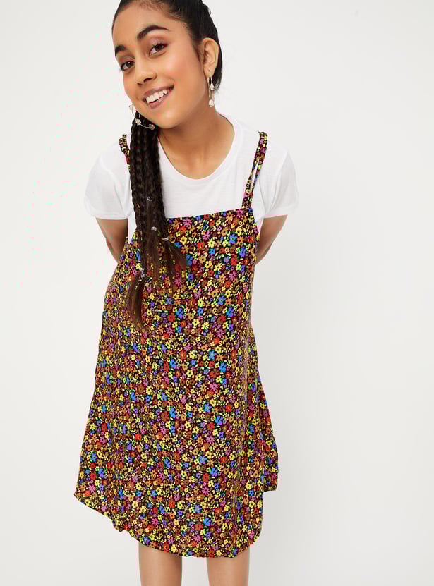 Induce comfort and style with this printed pinafore dress accentuated with a square neckline, spaghetti straps, inner lining, and a solid under-layering t-shirt with a round neckline and short sleeves.