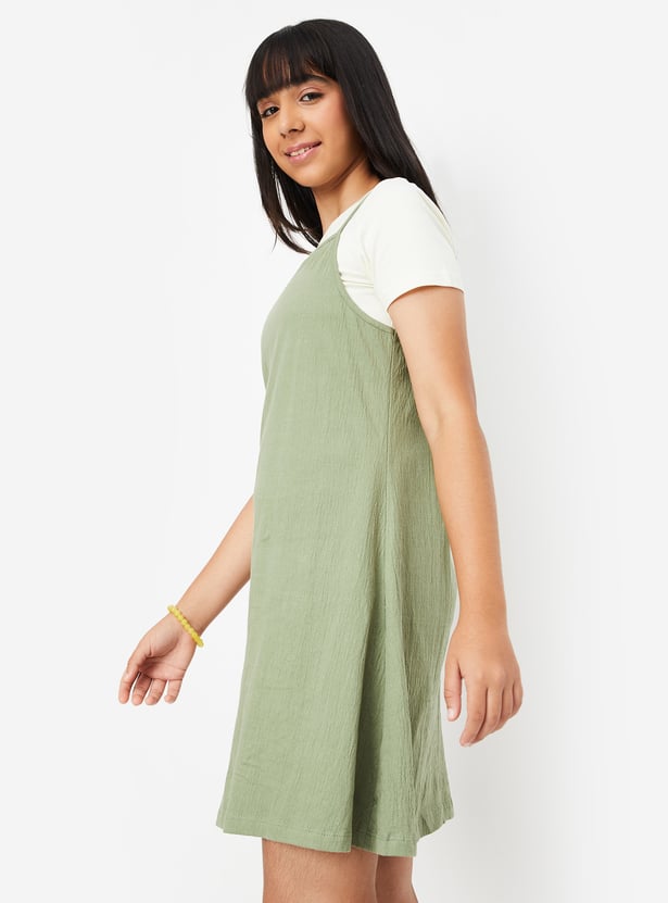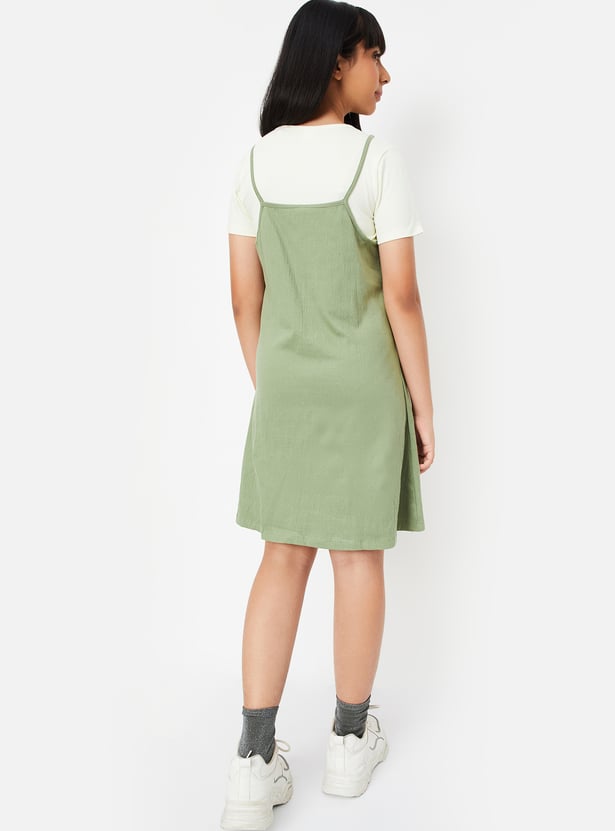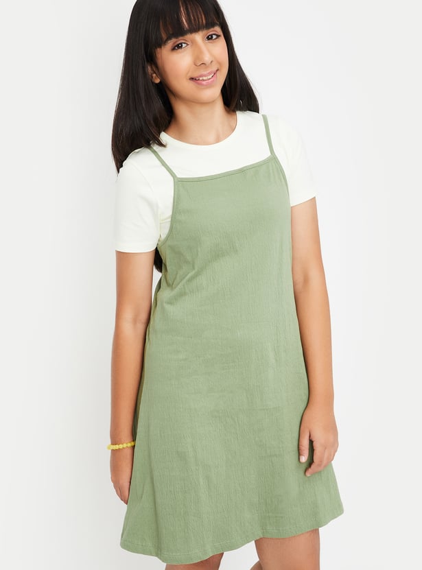 This solid knit dress combines the comfort of a T-shirt with the elegance of an A-line dress. Featuring a round neck and half sleeves tee, paired with shoulder straps dress, it offers a stylish and relaxed fit that's perfect for everyday wear.