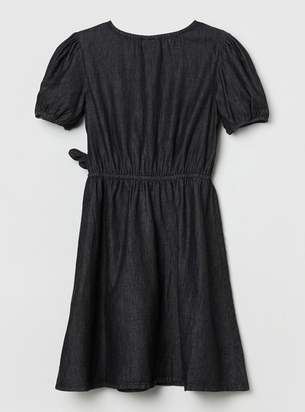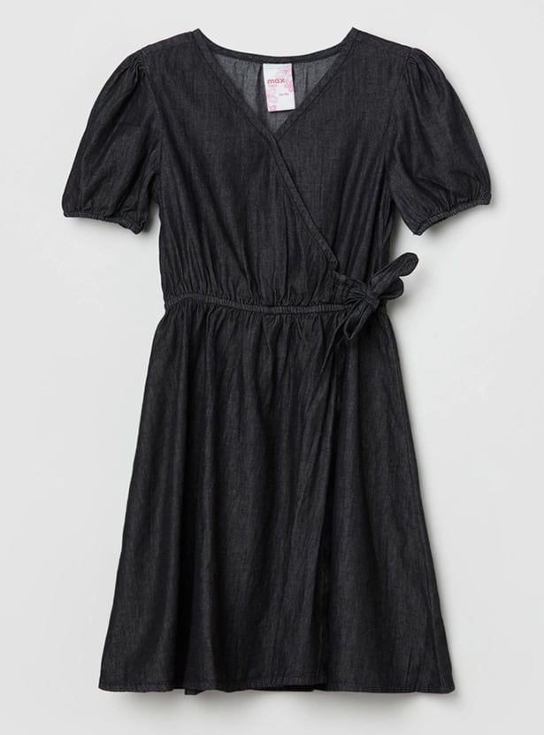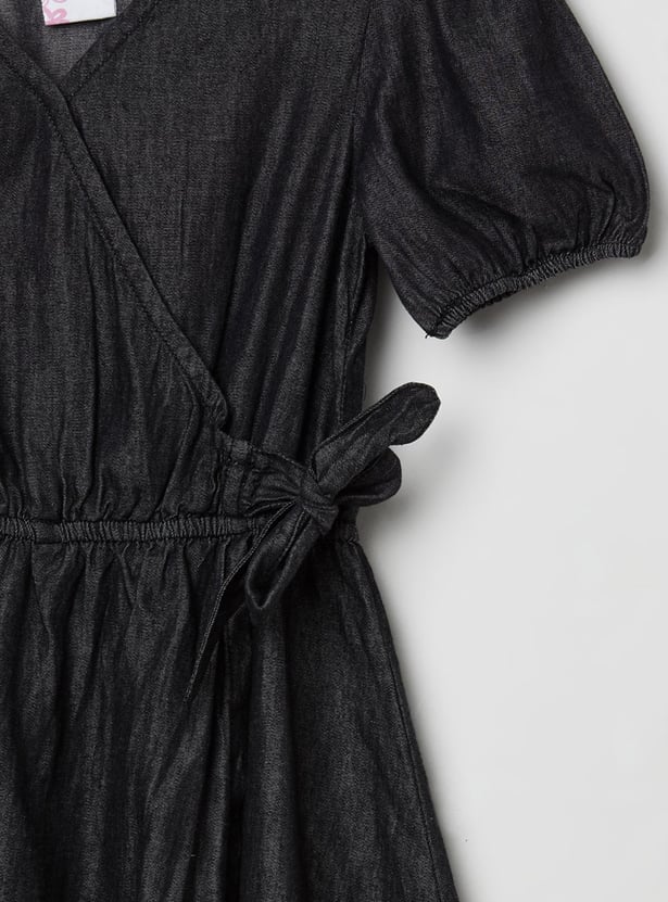 This A-line silhouette is designed with a V-neck, short sleeves, and a tie-up detail to keep up your little one's casual look.