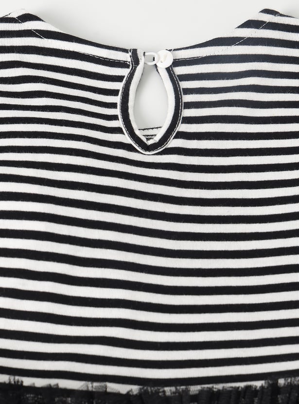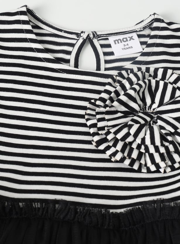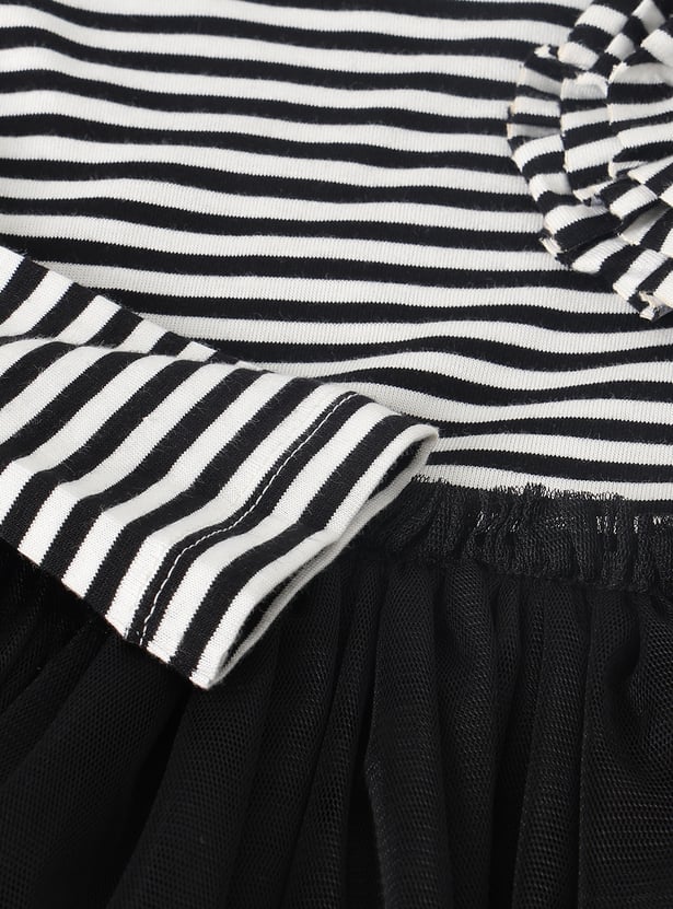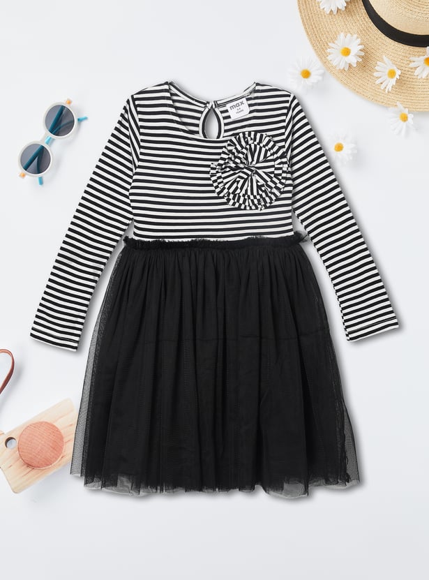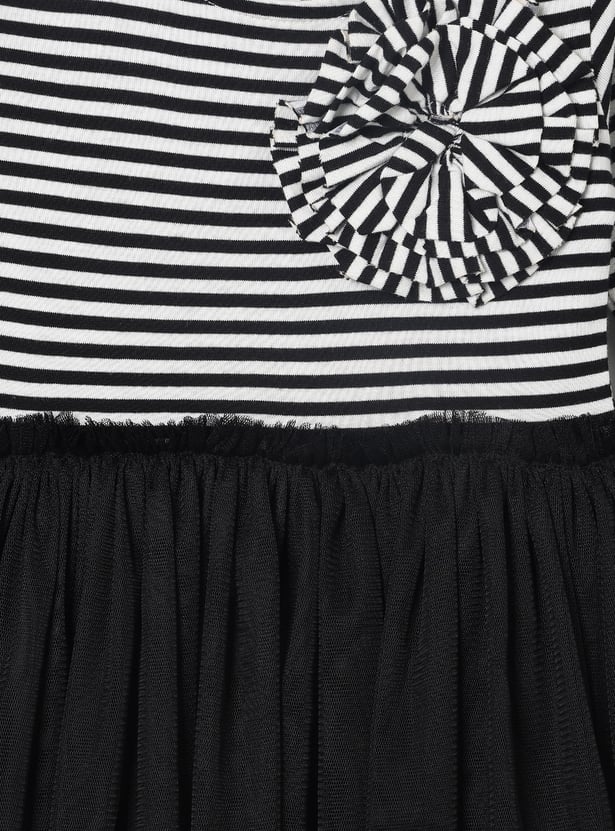 Bring a touch of whimsy to your wardrobe with this striped tulle dress! Featuring a classic round neck and back button closure, it’s designed with full sleeves for a graceful silhouette. The floral applique at the front adds a charming detail,