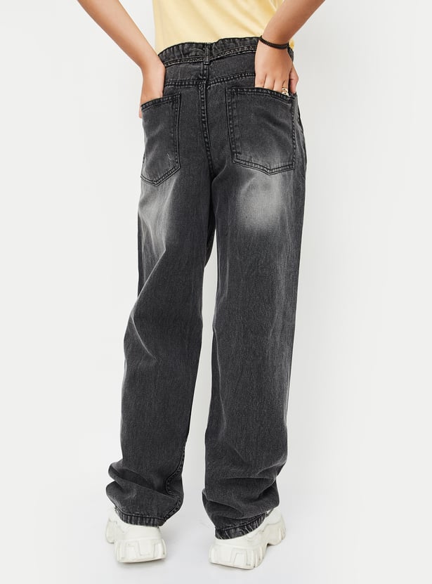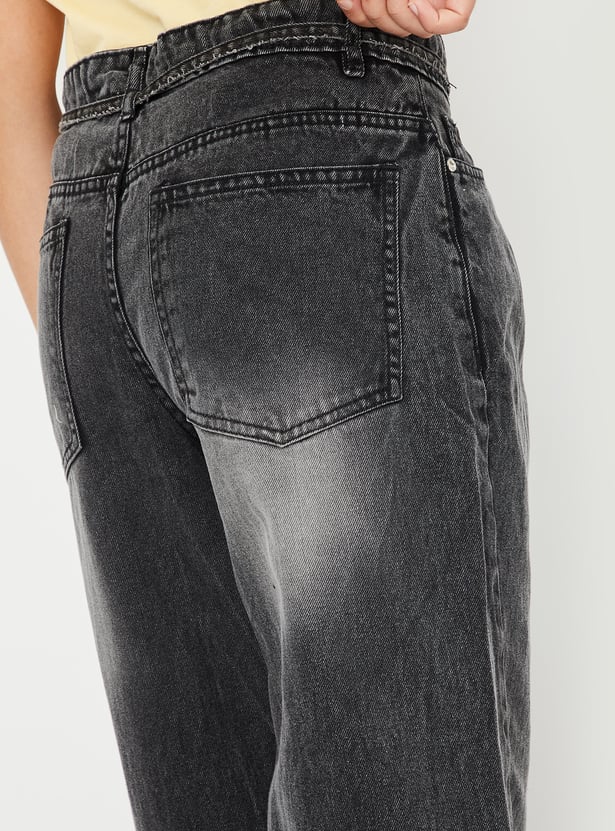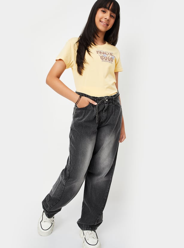 Upgrade your denim collection with these washed barrel fit jeans, offering a relaxed yet flattering silhouette. Featuring a button closure and classic 5-pocket design, they combine comfort and style effortlessly.