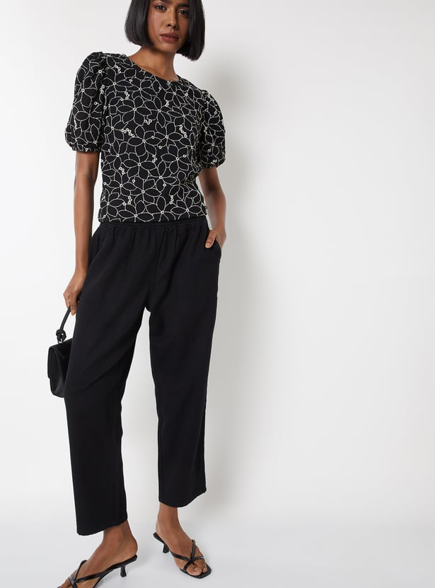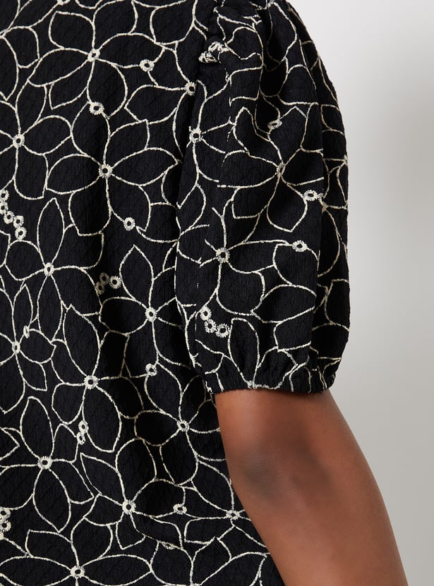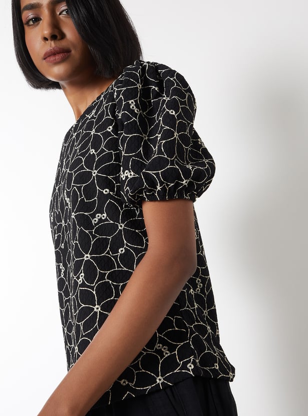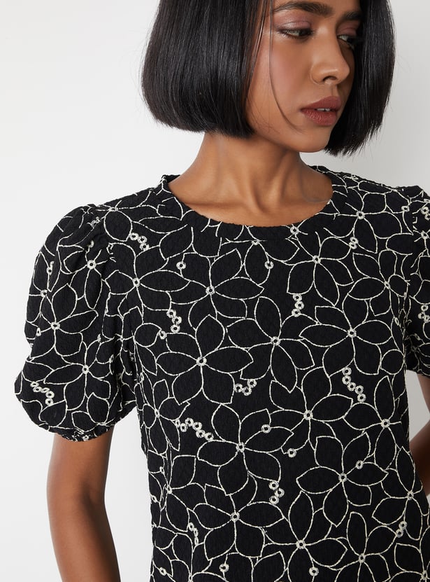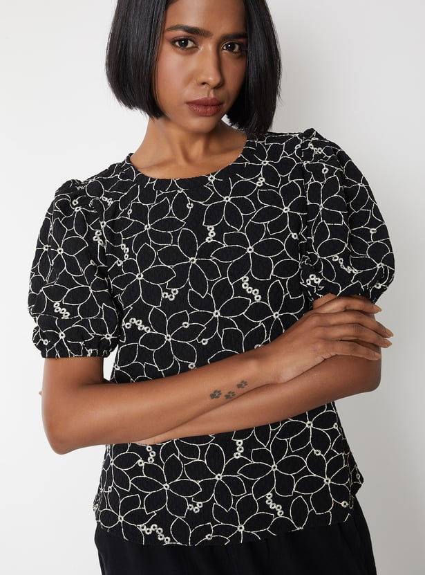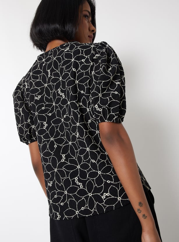 Add a charming touch to your look with this embroidered top, perfect for casual and semi-dressy occasions. It features a classic round neck and stylish puff sleeves, with delicate embroidery adding subtle elegance. Model Size :