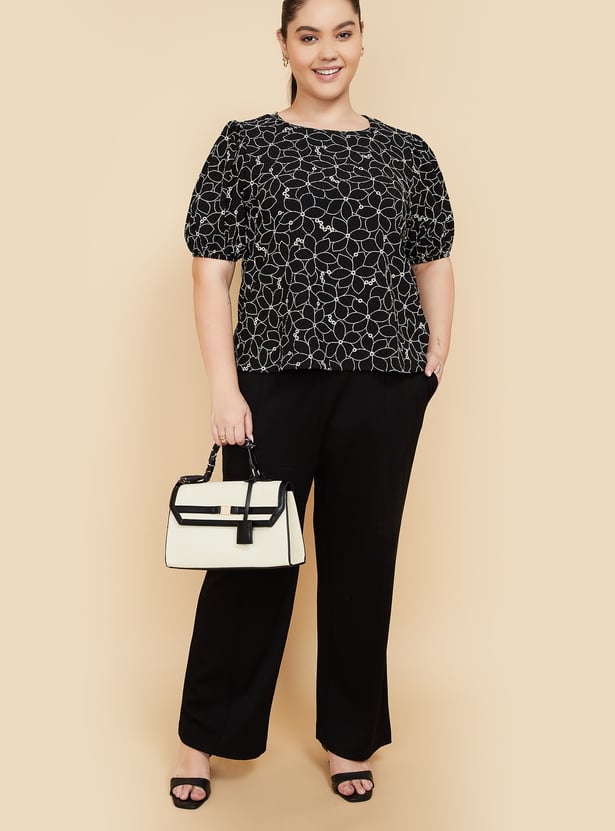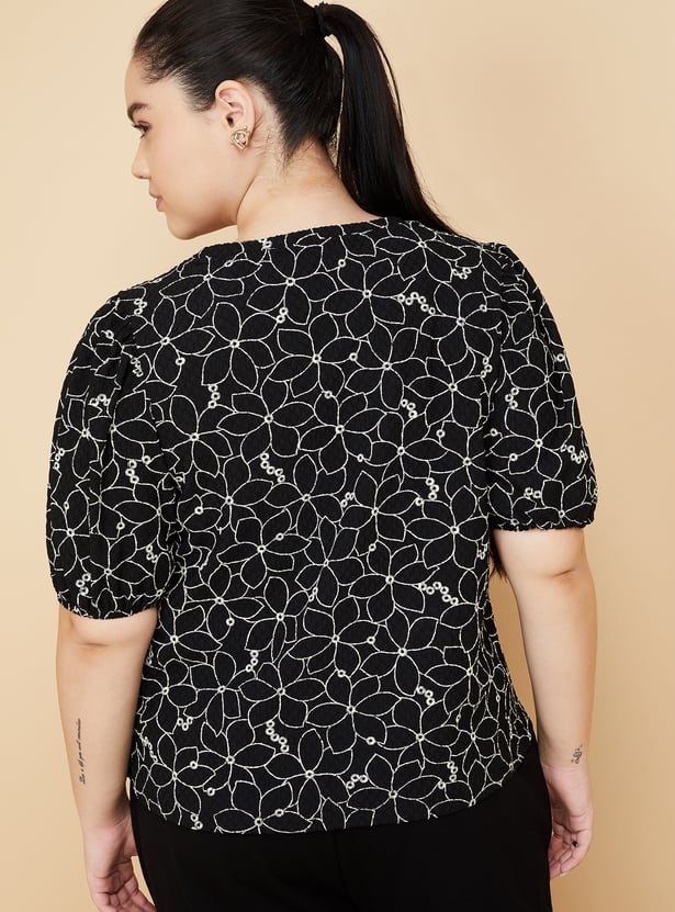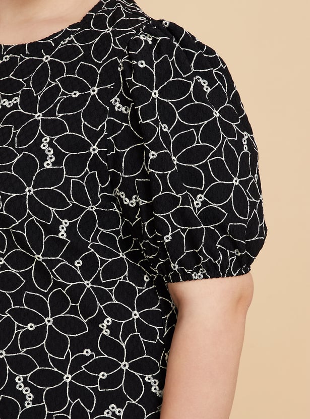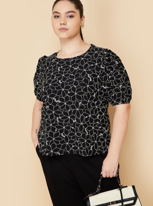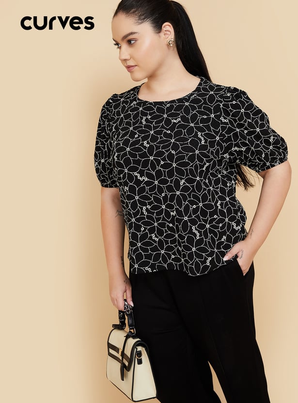 Add a charming touch to your look with this embroidered top, perfect for casual and semi-dressy occasions. It features a classic round neck and stylish puff sleeves, with delicate embroidery adding subtle elegance. Model Size :