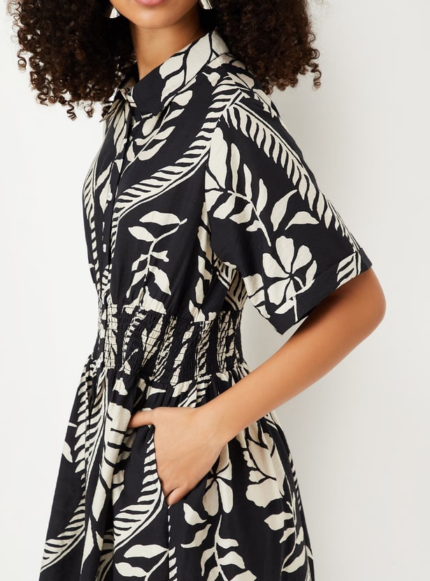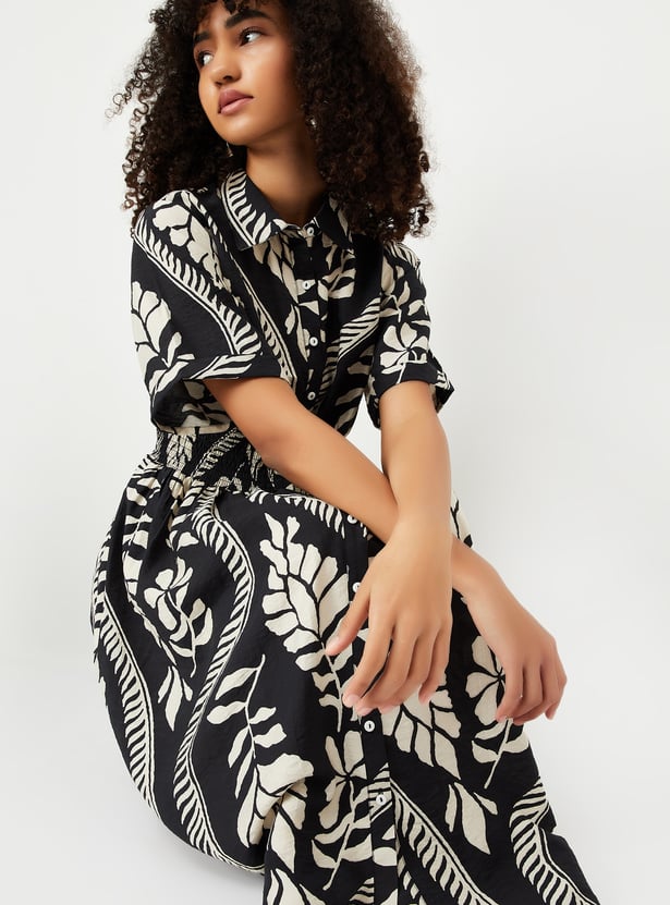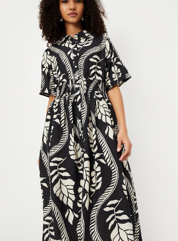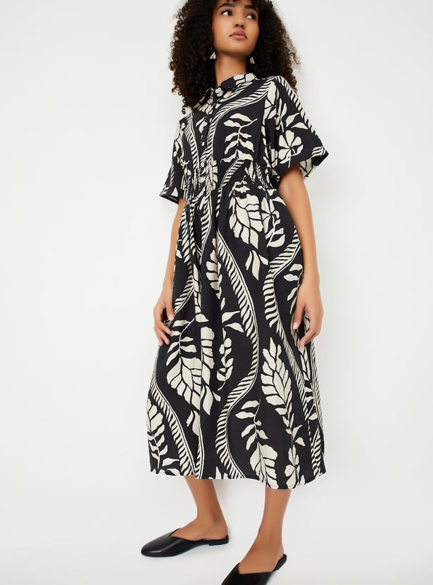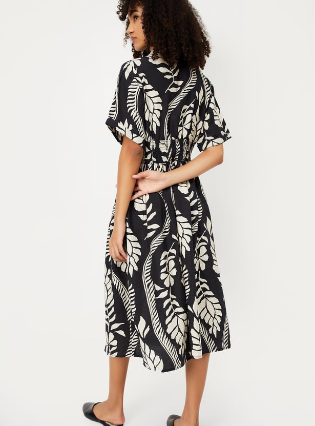 This printed midi dress combines effortless style with a flattering fit. Featuring a button placket, half sleeves, and a spread collar, it’s perfect for both casual outings and dressed-up occasions.