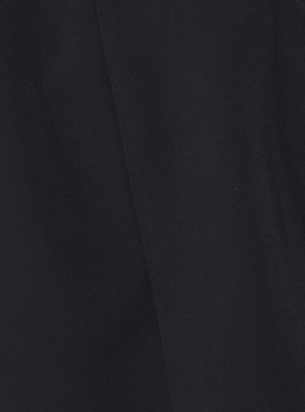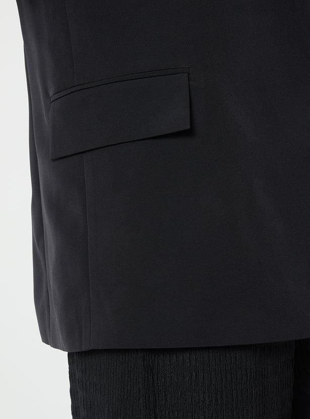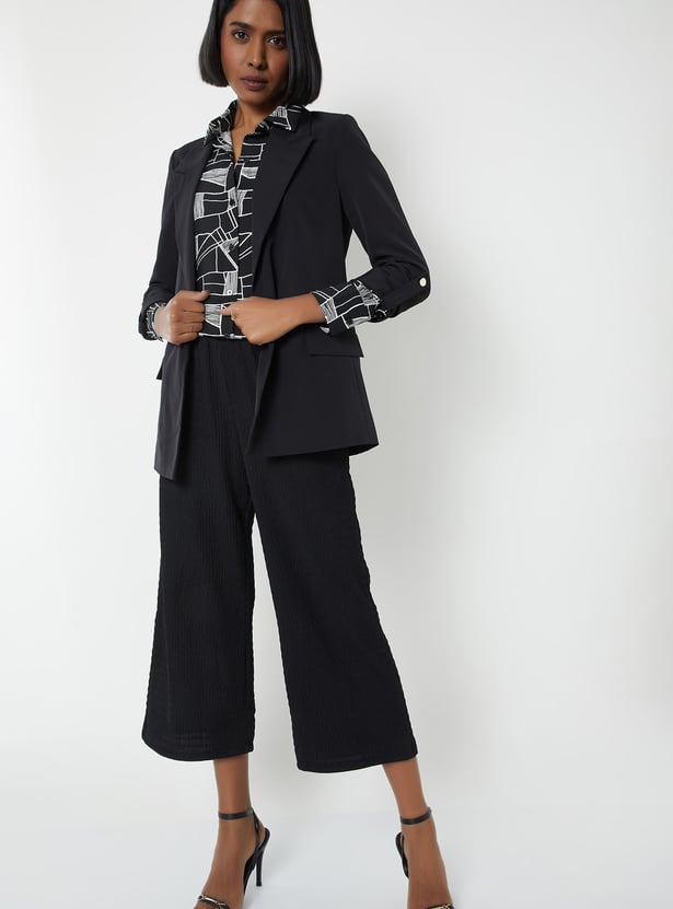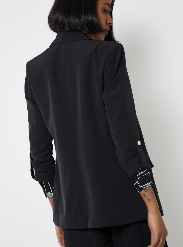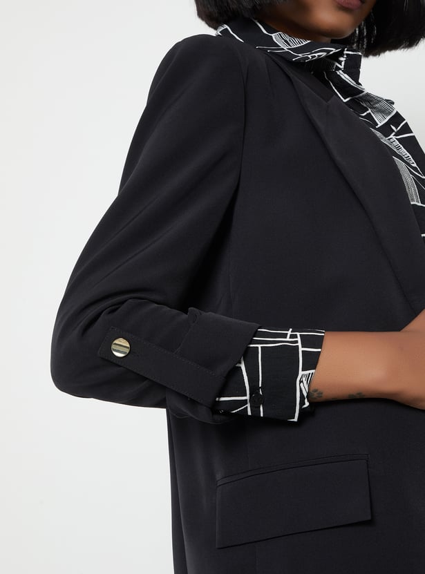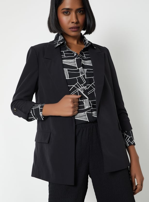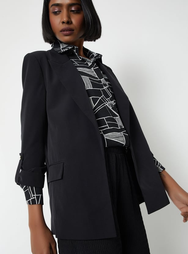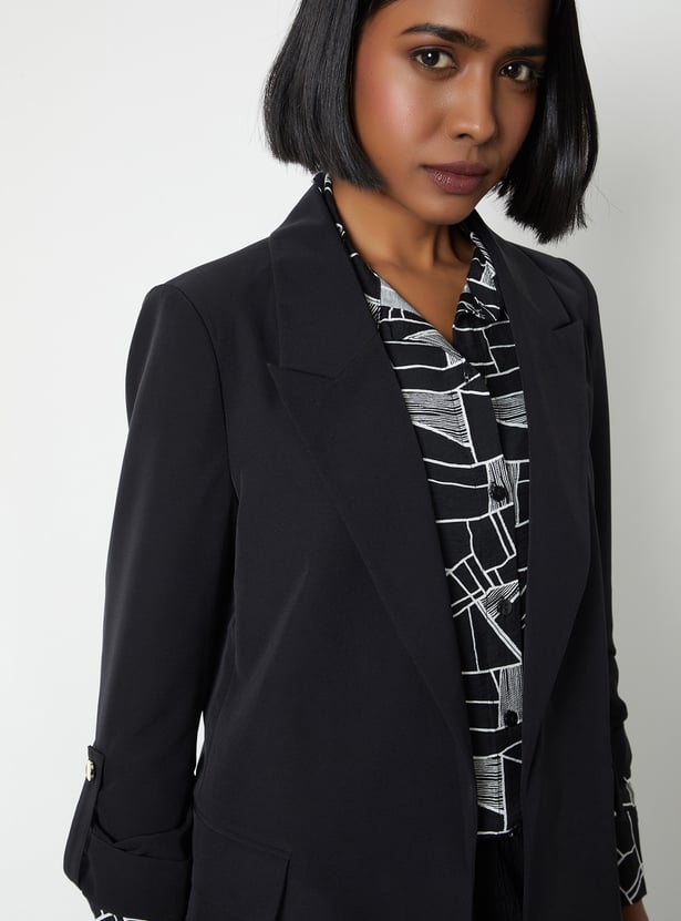 Elevate your look with our solid formal blazer — crafted in a regular fit with a peaked lapel collar, open front, and 3/4th sleeves with fold tabs for a polished yet relaxed touch.