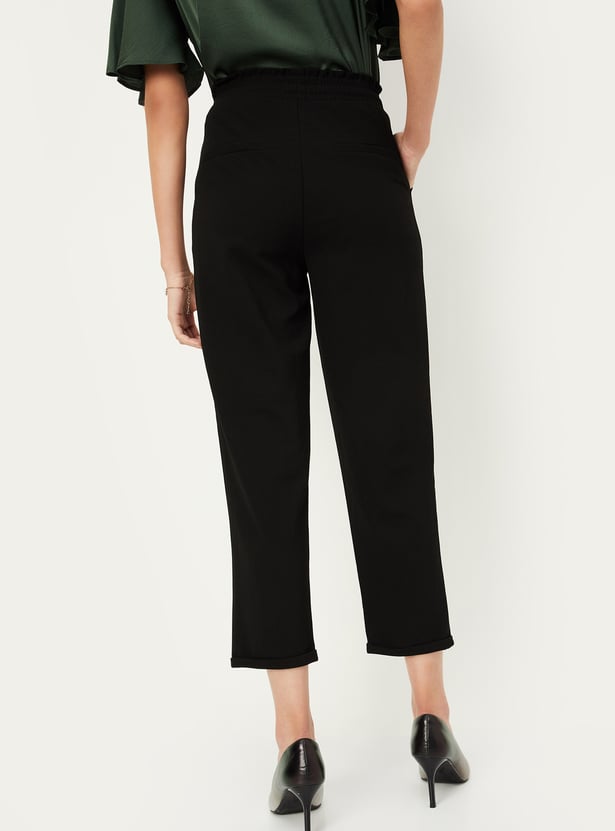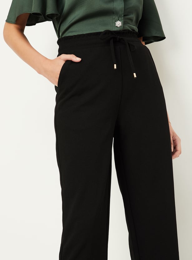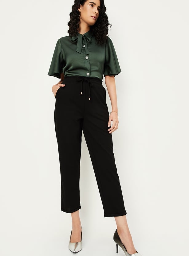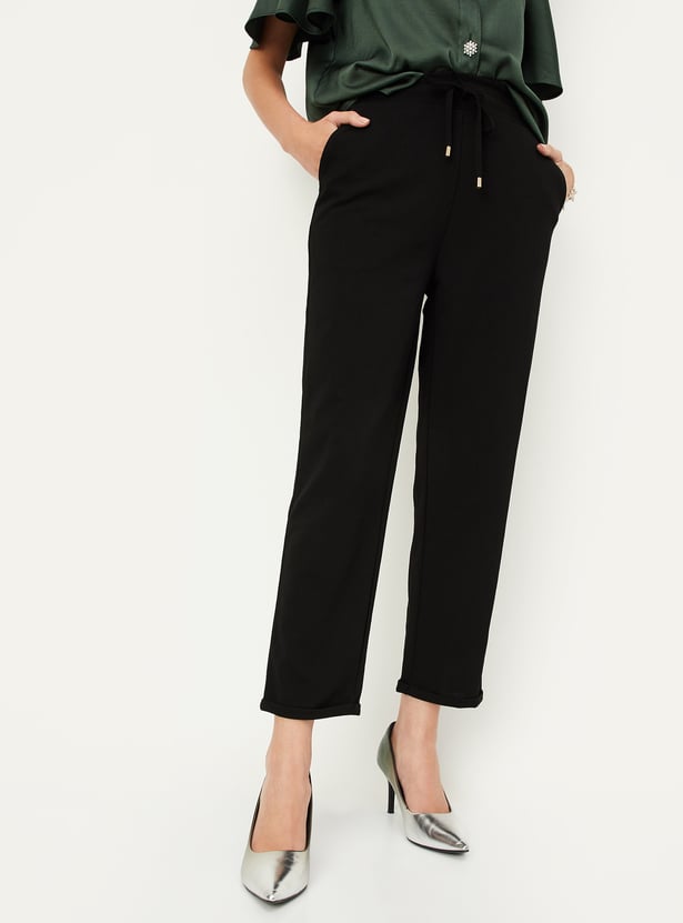 Put together a chic and comfortable look with this pair of trousers, featuring a solid surface, an elasticated waist with a drawstring closure, and convenient pockets. The turned hem and an ankle-length profile complete the look. Model Size :