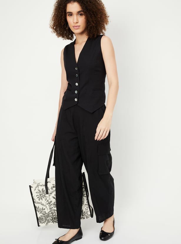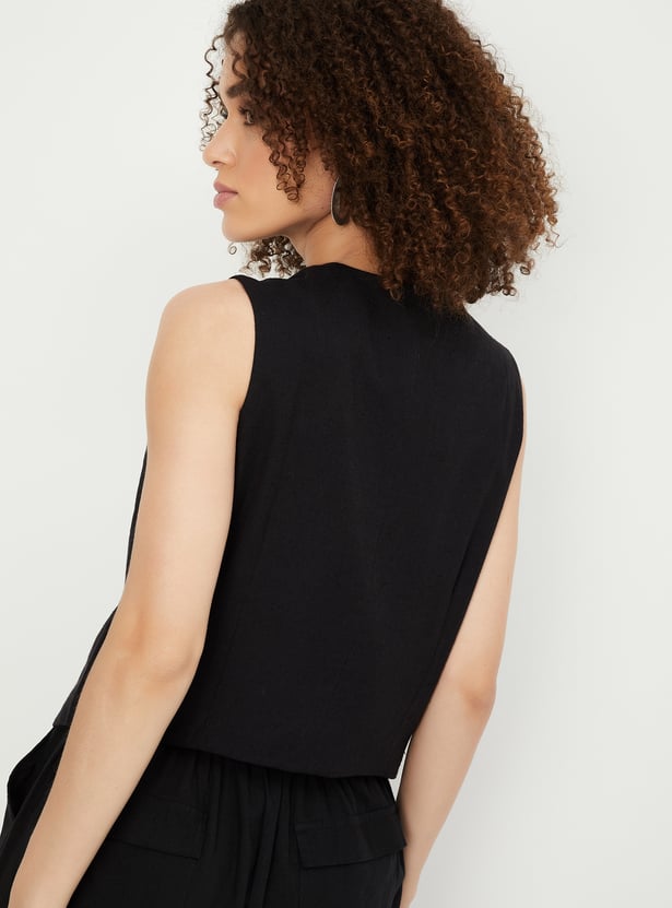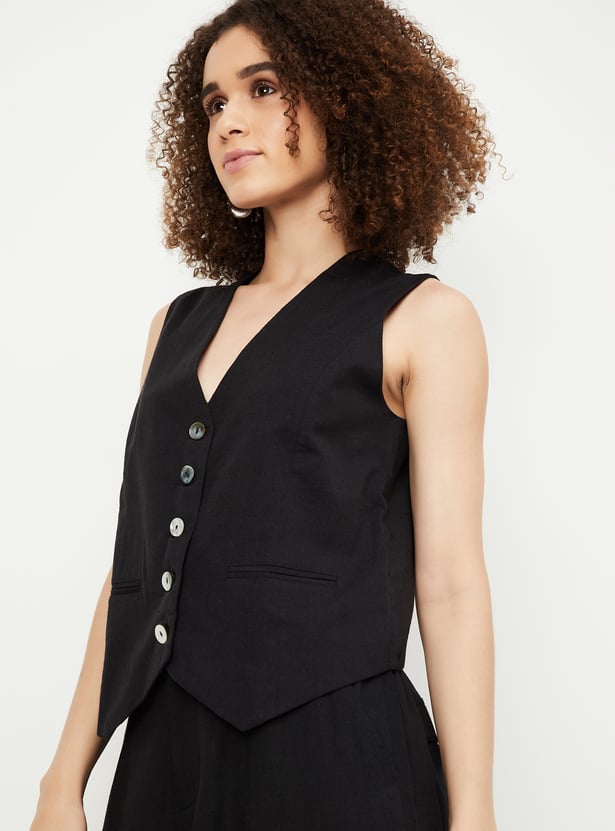 Revamp your style with this sleeveless solid waistcoat. Boasting a V-neck, front button placket, and an asymmetrical hem, it's ideal for sprucing up your semi-formal look.