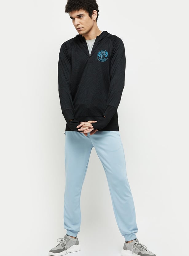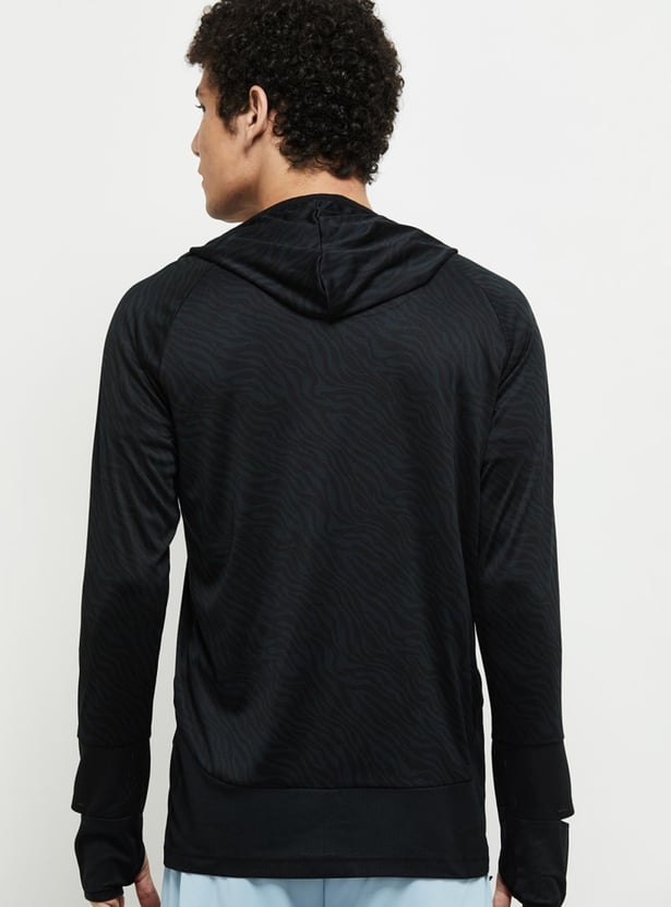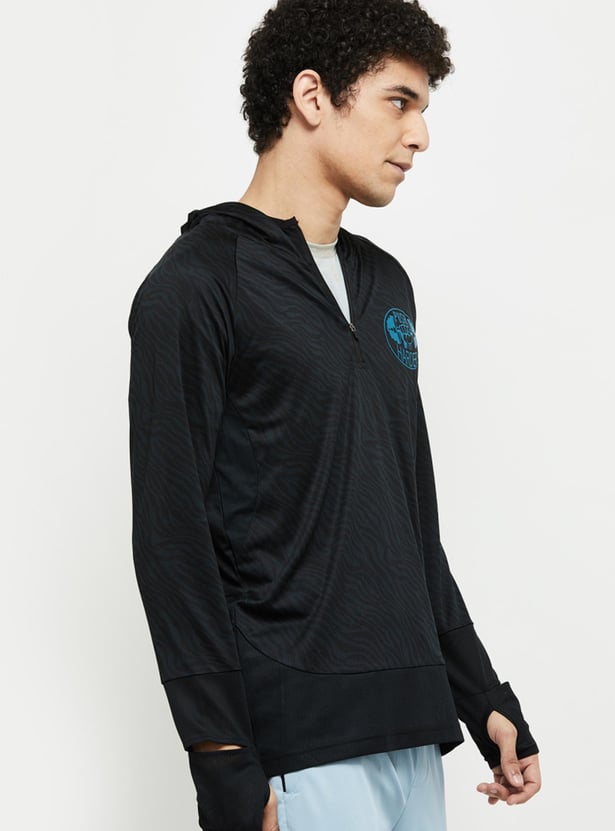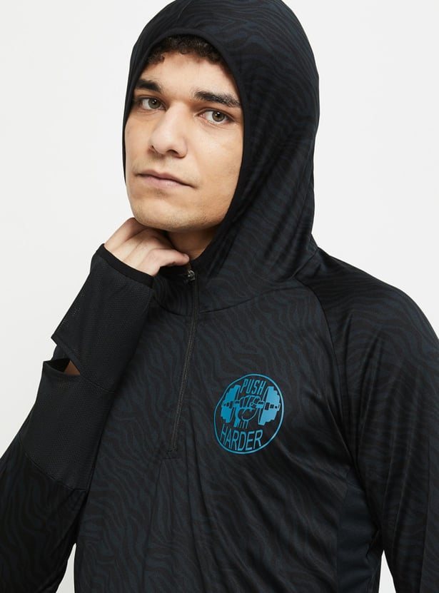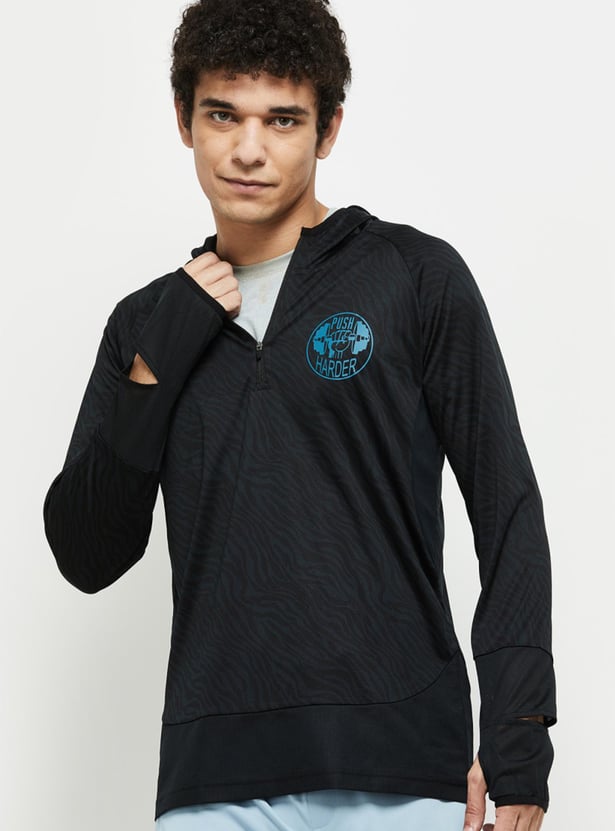Head out to the gym or a jog with this printed T-shirt which has a zip closure, hood, and long sleeves with cut-out detail.