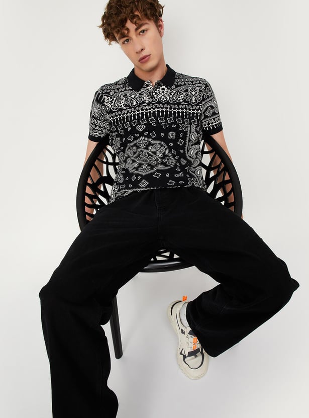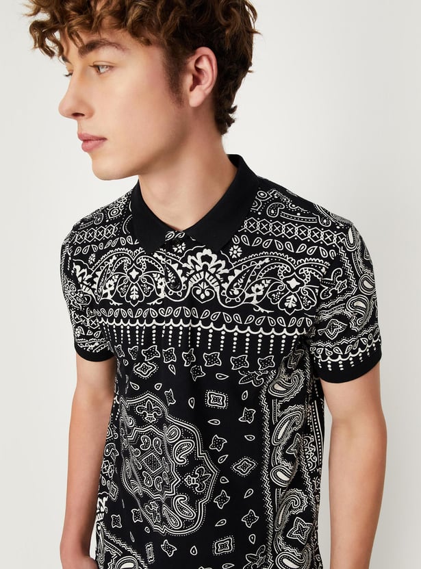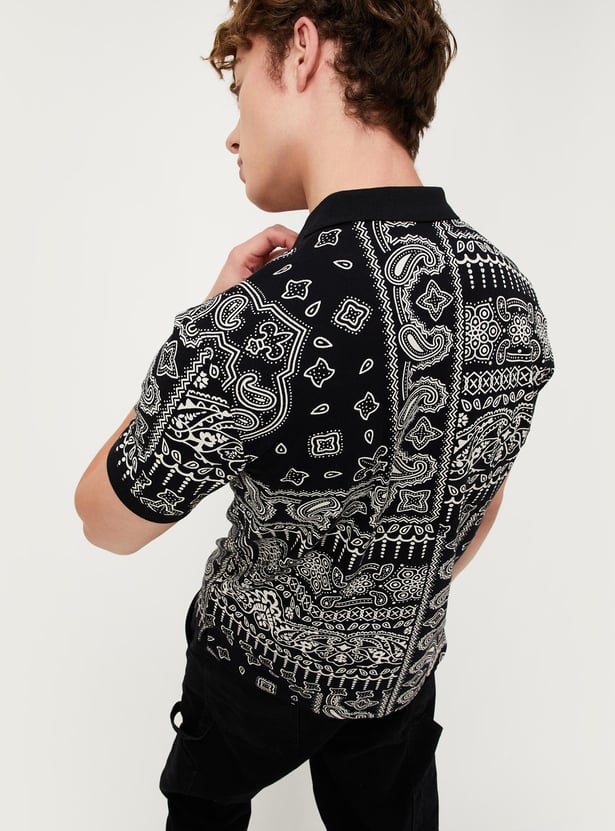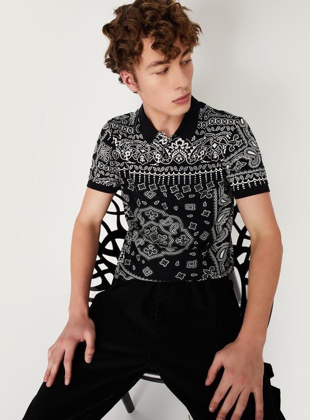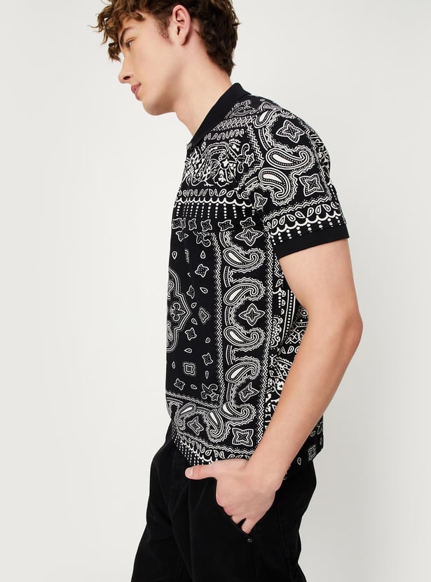 This polo T-shirt will elevate your casual attire. It has a bandana printed design, polo collar, half sleeves, side slits at the hem. Pair this t-shirt with a pair of chinos and loafers to brighten up your look.