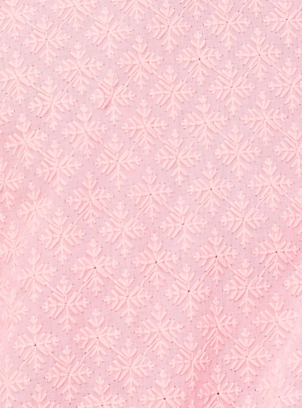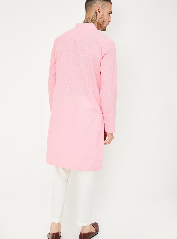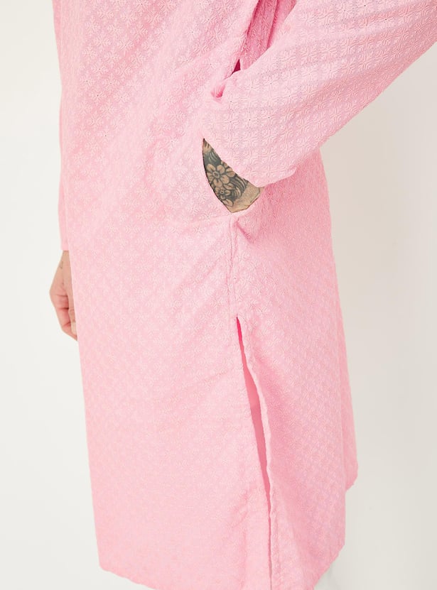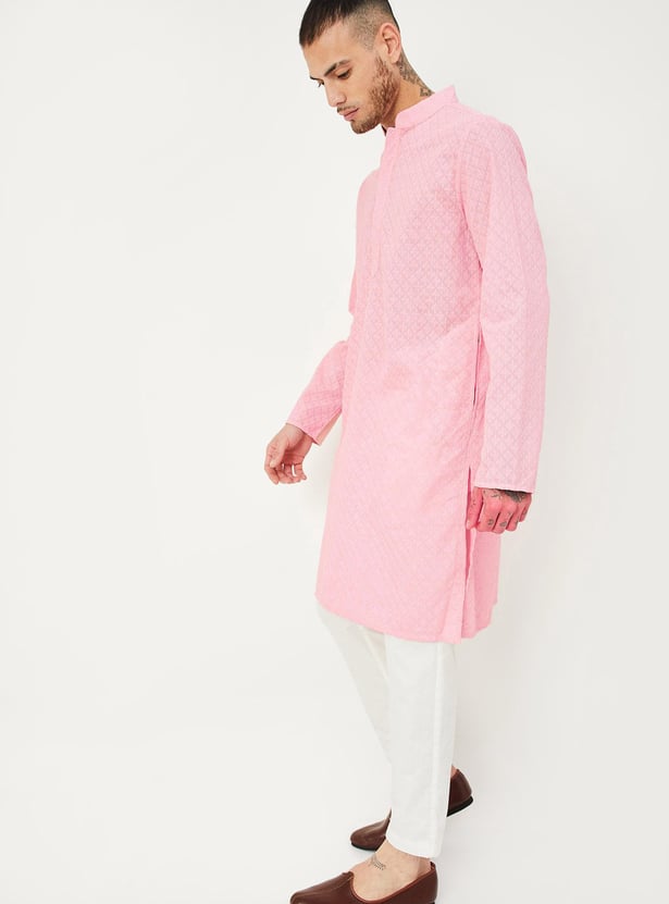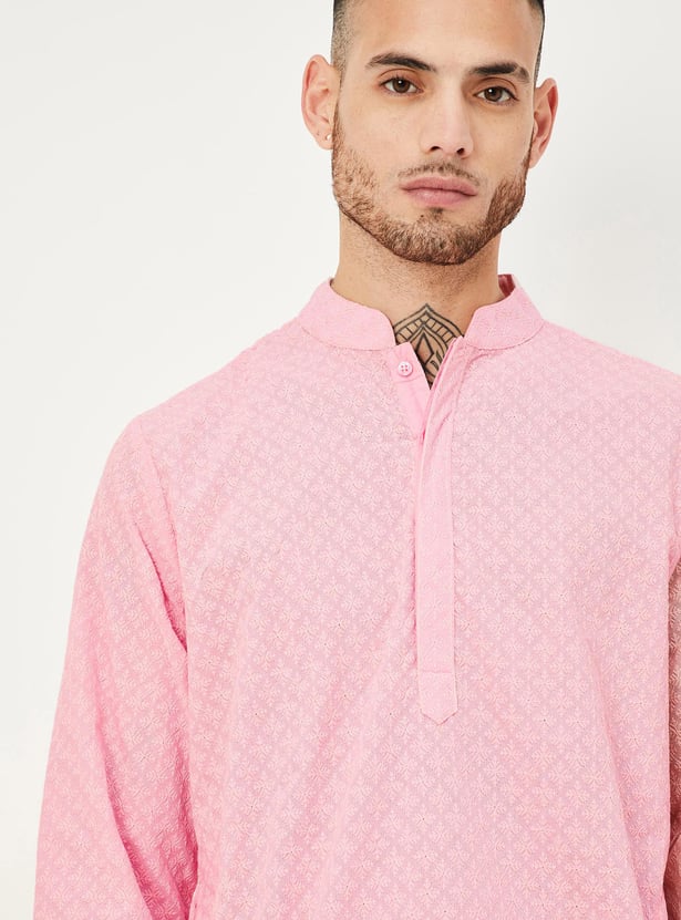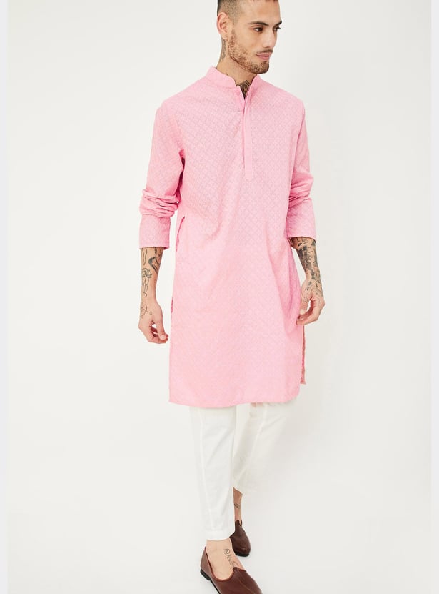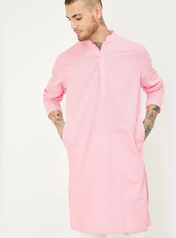 This kurta is a versatile addition to your collection and is styled with a band collar, a button placket with embroidered surface, full sleeves, pockets, and side slits.