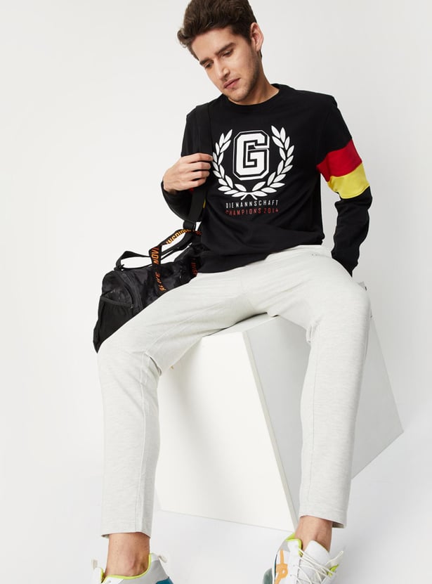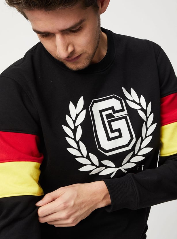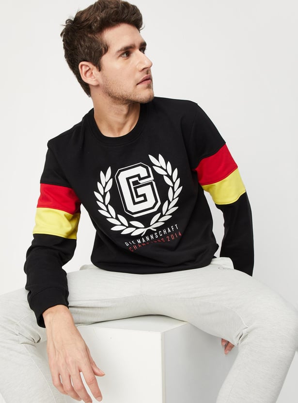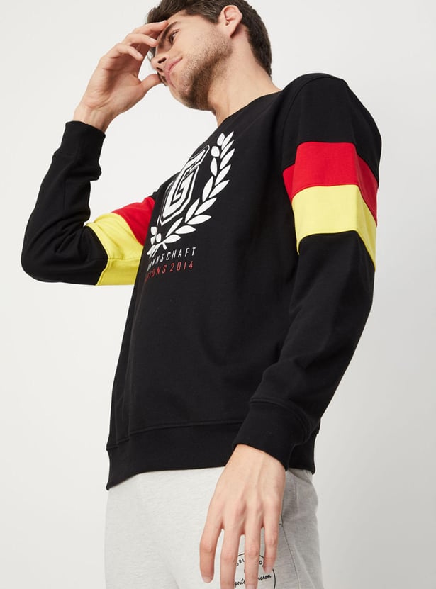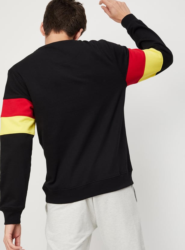 The perfect intersection of street and sporty styles, this sweatshirt is highlighted with graphic prints and applique on the chest. It features a crew neck, long sleeves with a colourblock design, and ribbed trim. Style the sporty look by teaming up this sweatshirt with joggers and sneakers.