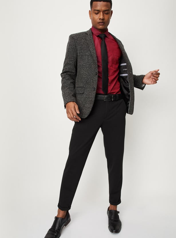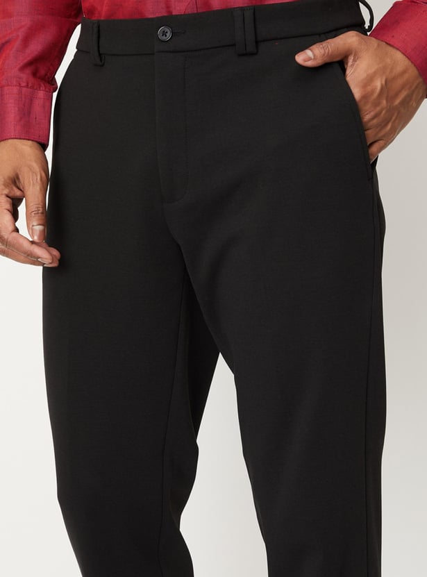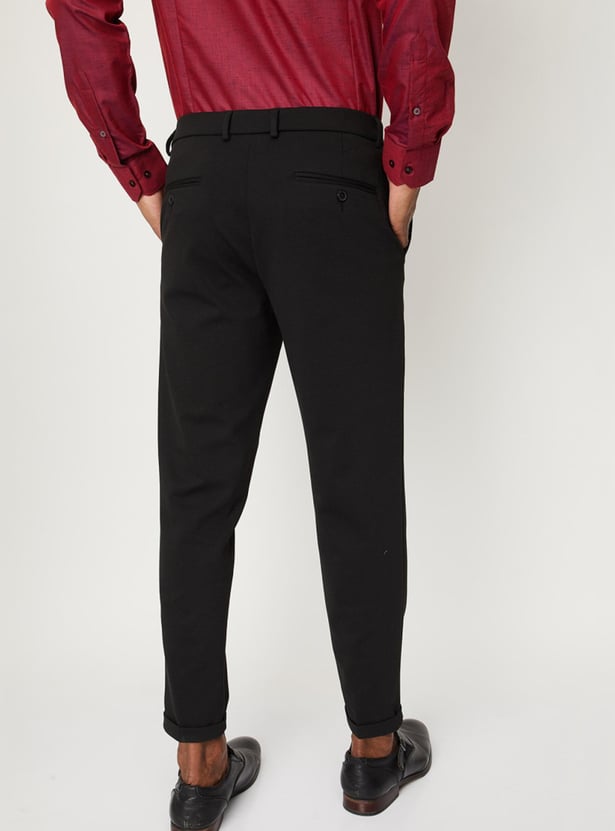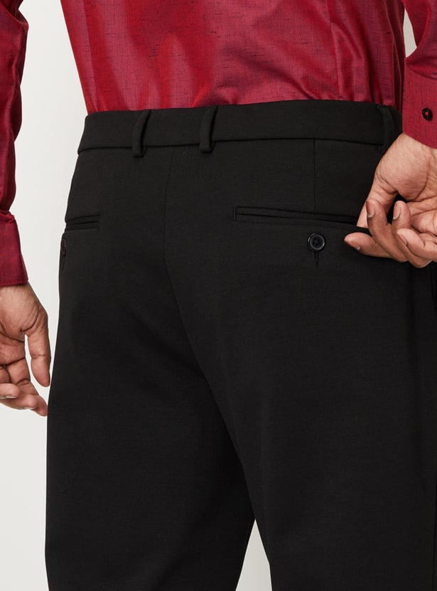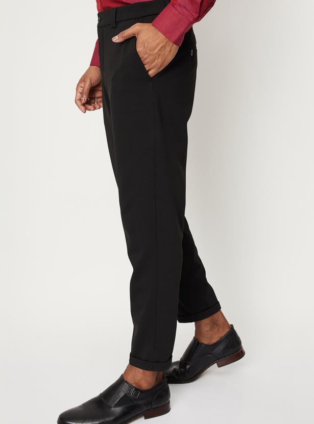 Dress to the nines in this pair of trousers in a carrot-fit profile. It features a belt loop waist, knit pattern, flat front, side pockets, back buttoned welt pockets, and an ankle-length profile. Team up this pair of trousers with polo and lace-ups for a smart look.