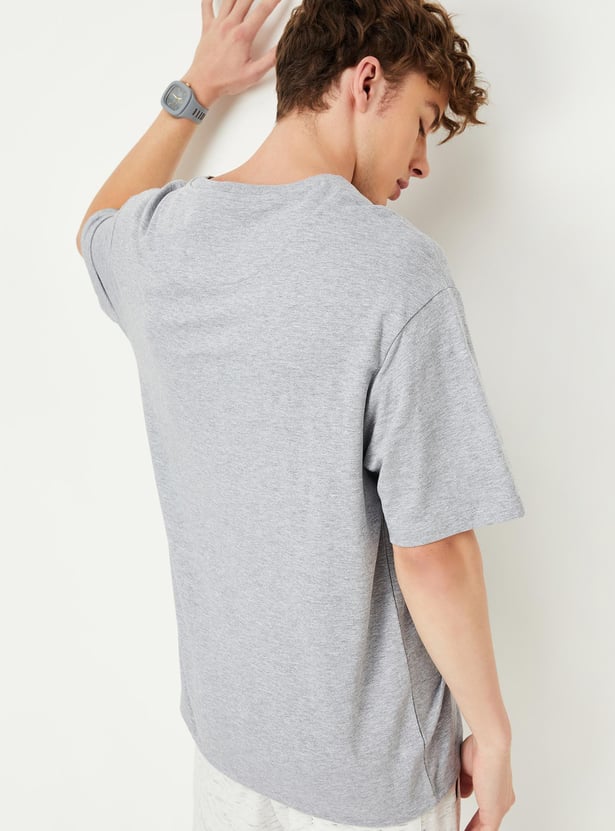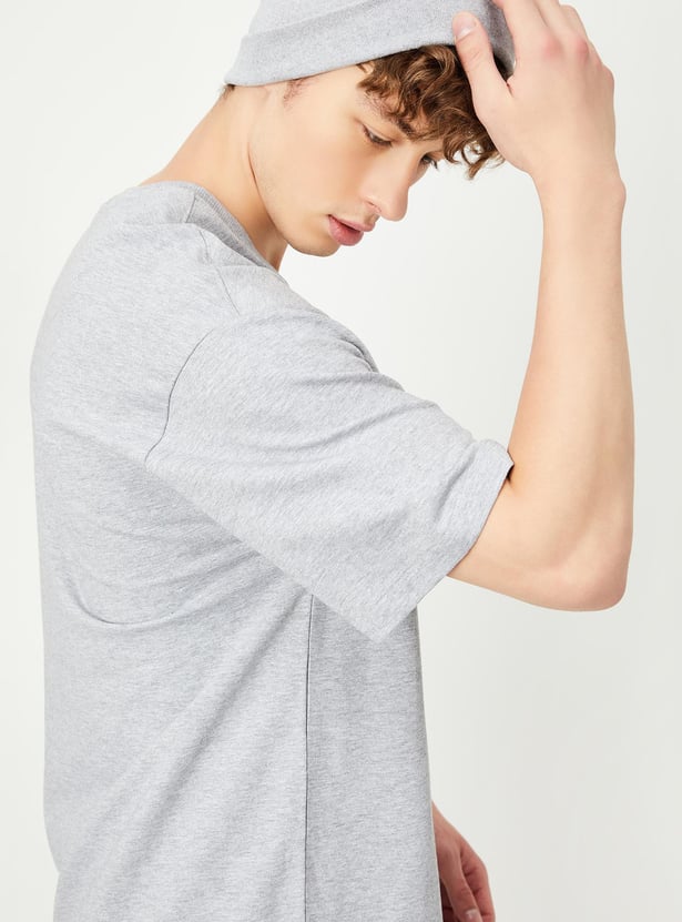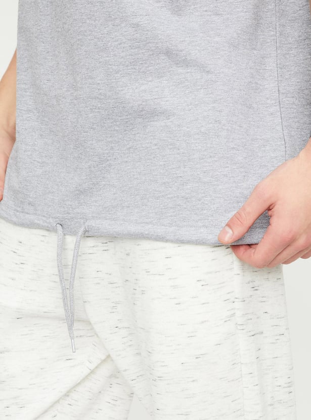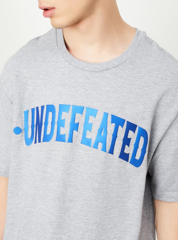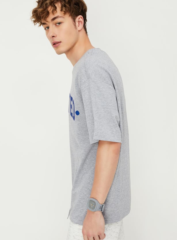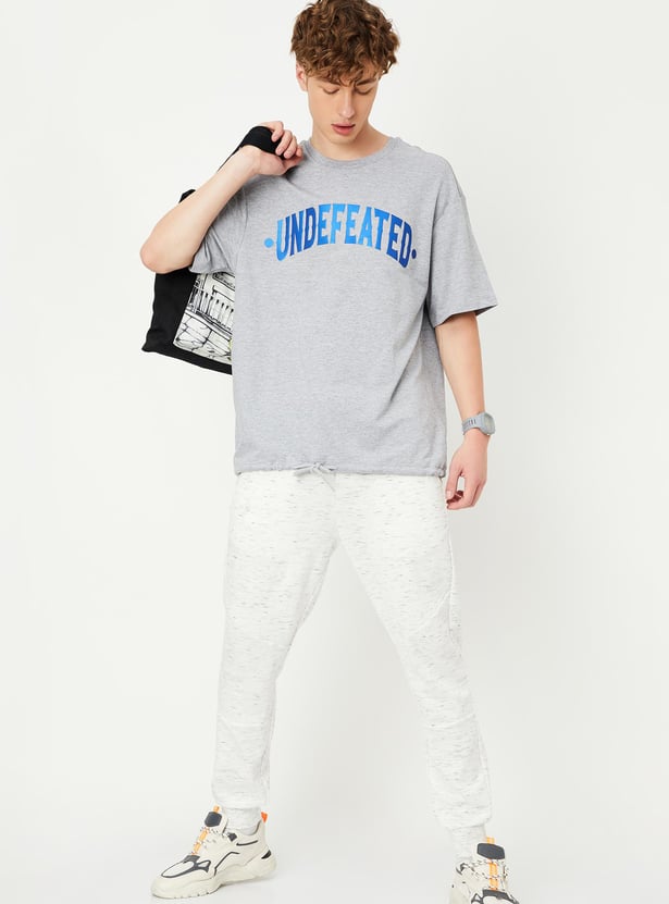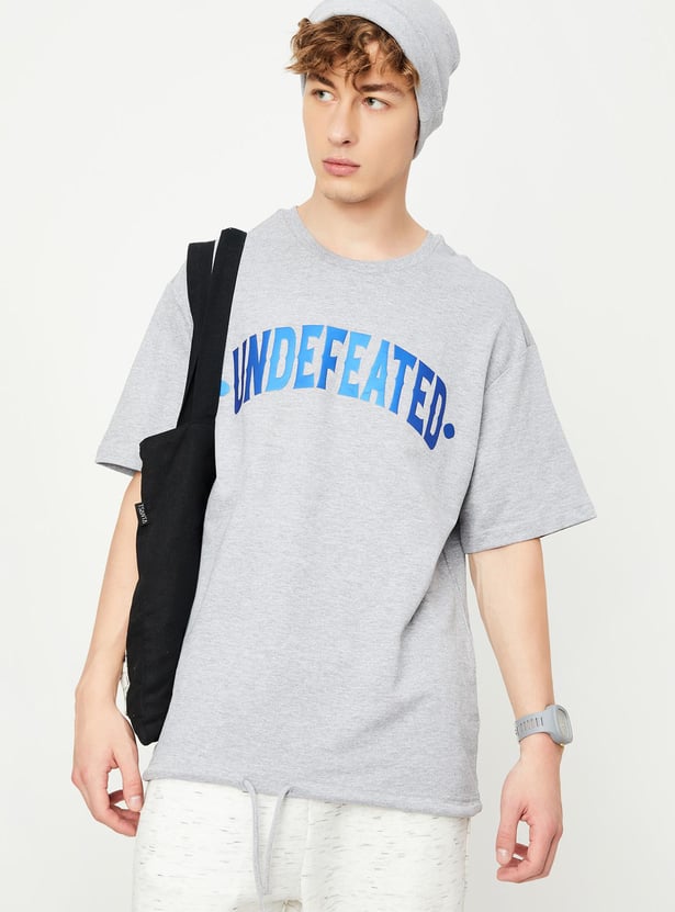 Achieve a stylish appearance with this oversized typography print t-shirt. It features half sleeves, a crew neck, and a drawstring at the hem, adding a trendy touch to your look. Create a comfortable and casual weekend outfit by pairing it with jeans and sneakers.