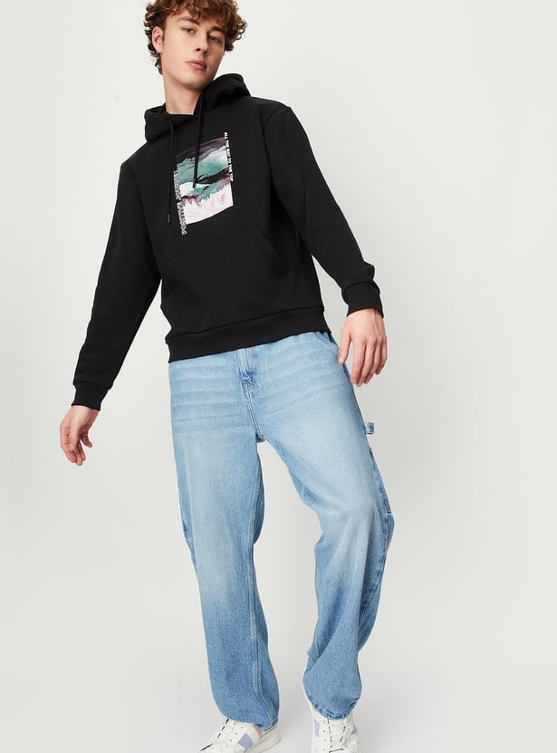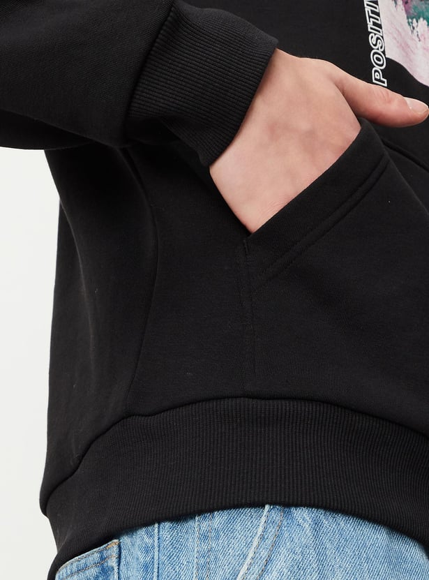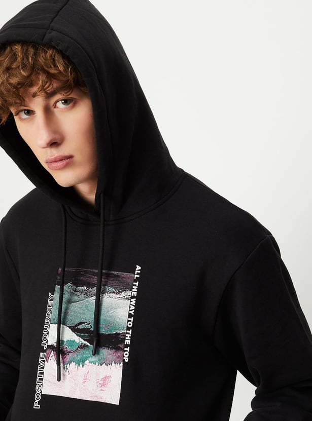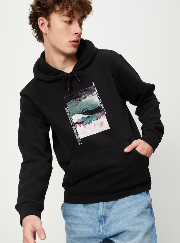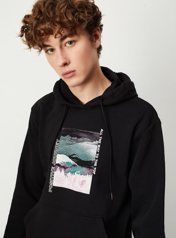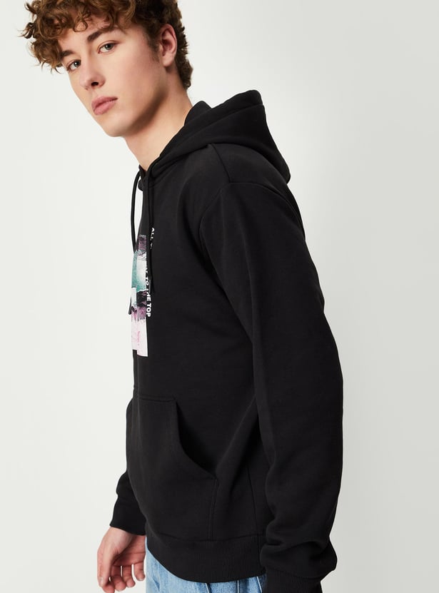 This sweatshirt looks like a great addition to your winter wardrobe. The printed detail on the chest adds a nice touch of style. You'll appreciate the hooded neck with drawstrings, long sleeves, kangaroo pocket, and ribbed trim - all great features for staying comfortable and warm. Pair it with some cargo pants and sneakers for a cool, casual look.