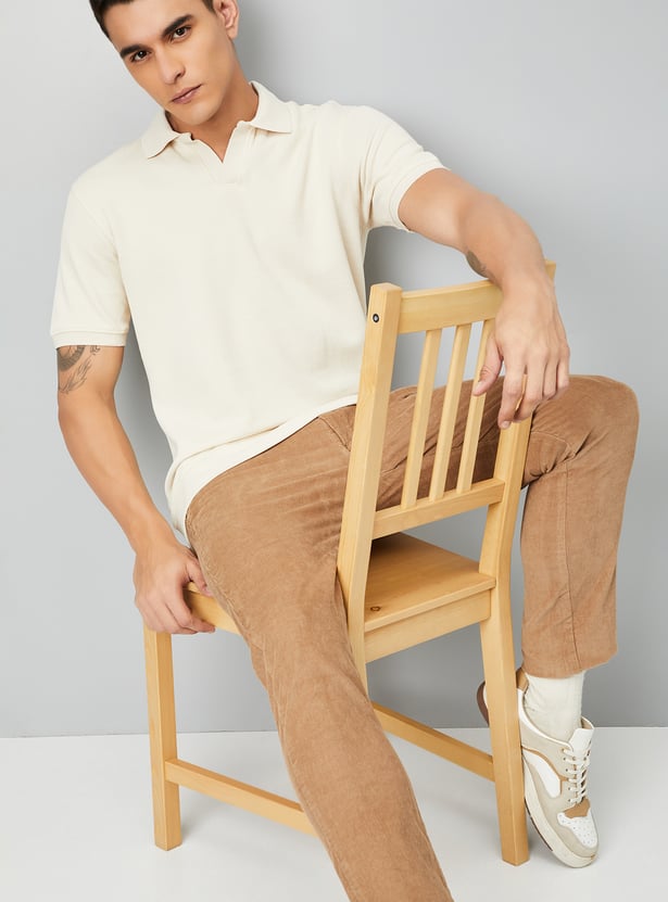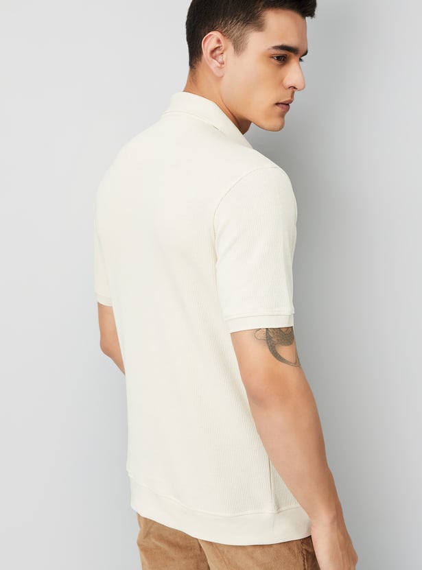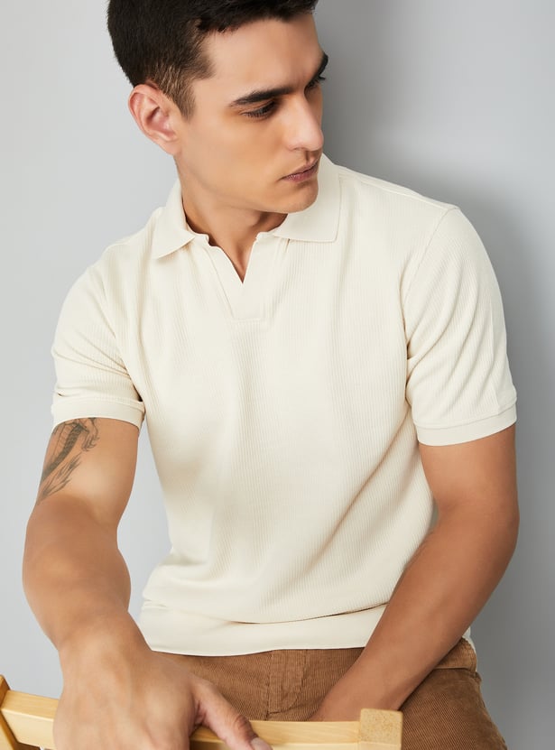Upgrade your casual wardrobe with this ribbed polo T-shirt. Featuring a classic johnny collar, and half sleeves, it offers both comfort and style in one versatile piece.