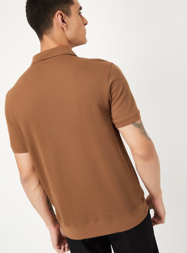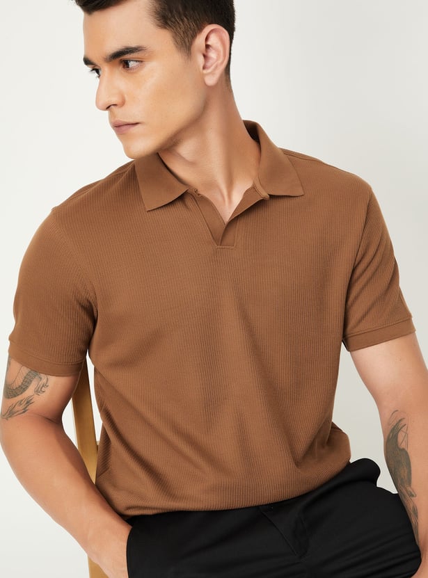 Upgrade your casual wardrobe with this ribbed polo T-shirt. Featuring a classic johnny collar, and half sleeves, it offers both comfort and style in one versatile piece.