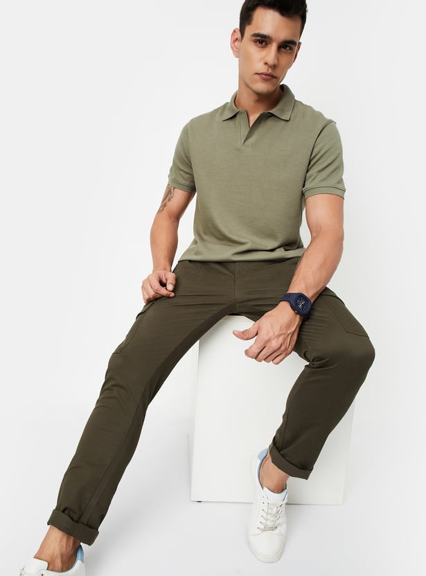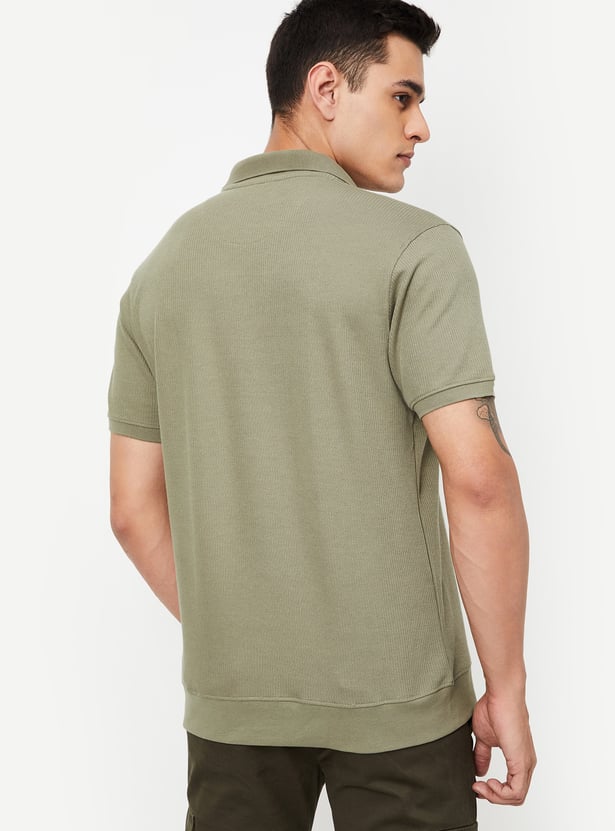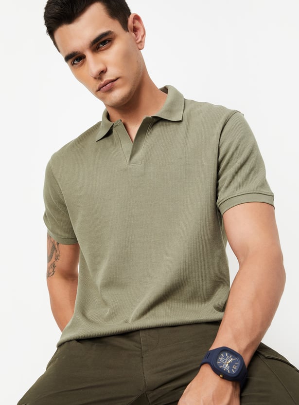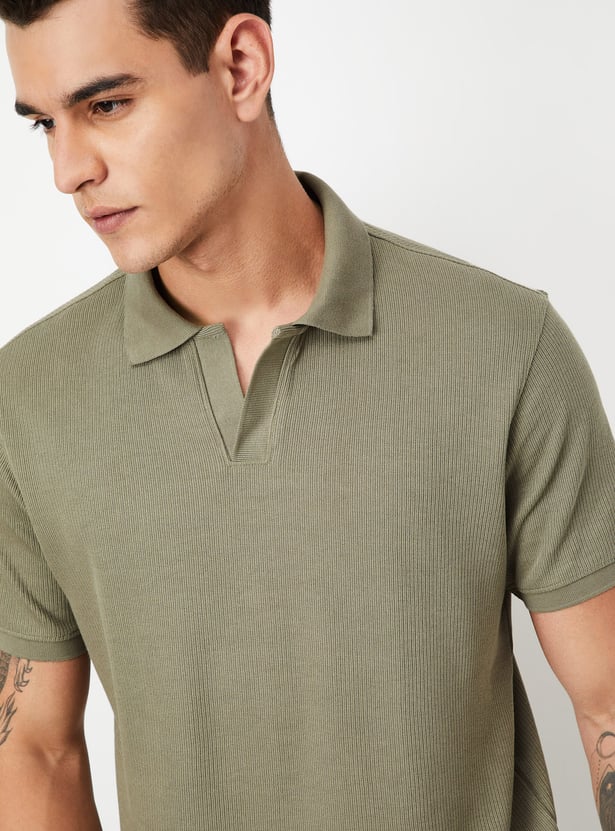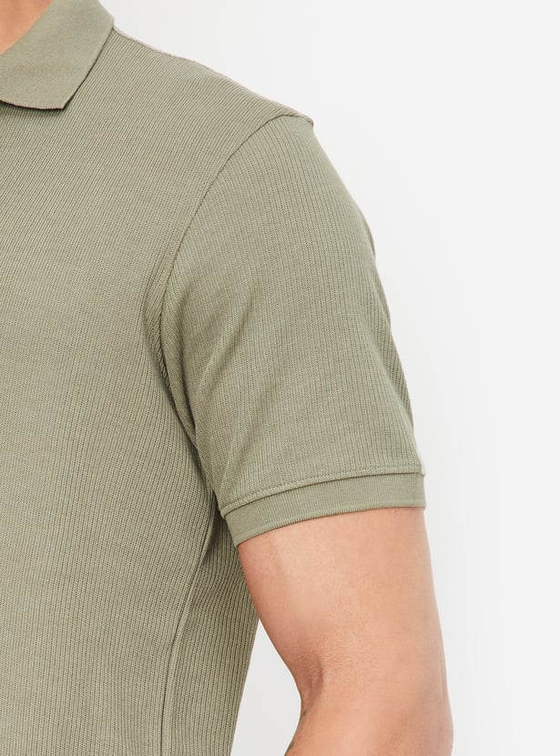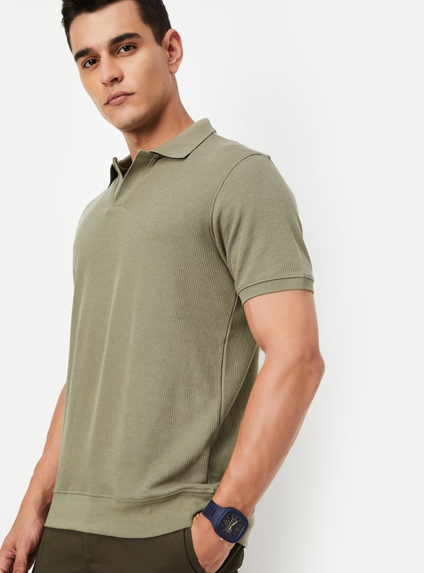 Upgrade your casual wardrobe with this ribbed polo T-shirt. Featuring a classic johnny collar, and half sleeves, it offers both comfort and style in one versatile piece.