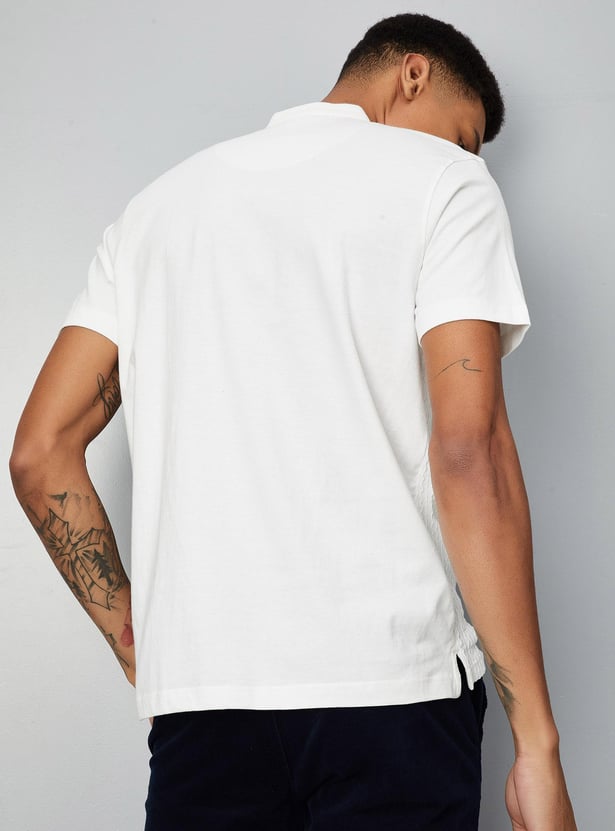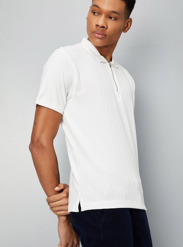 This textured t-shirt with short sleeves, a polo collar, and a zip placket adds a fashionable flair to your casual outfit.