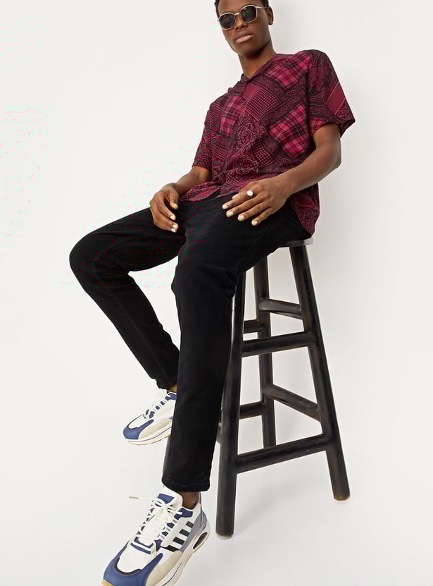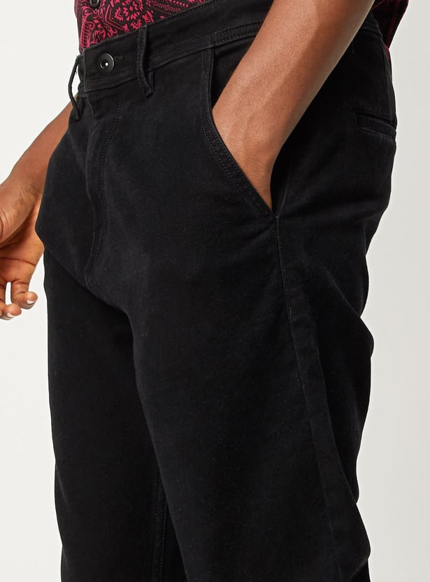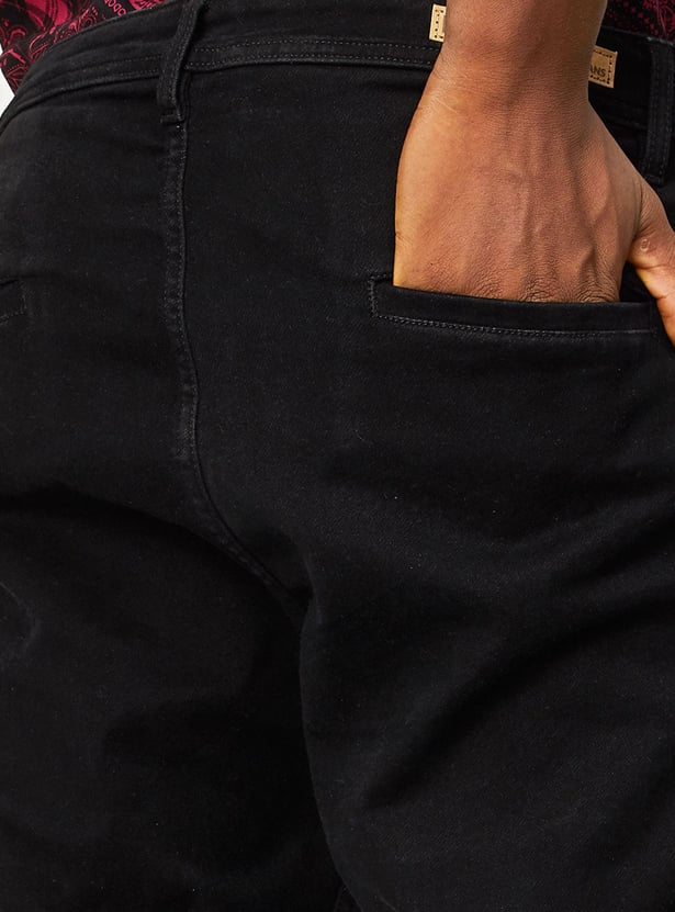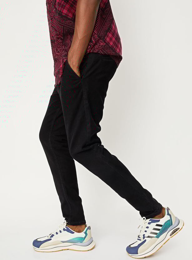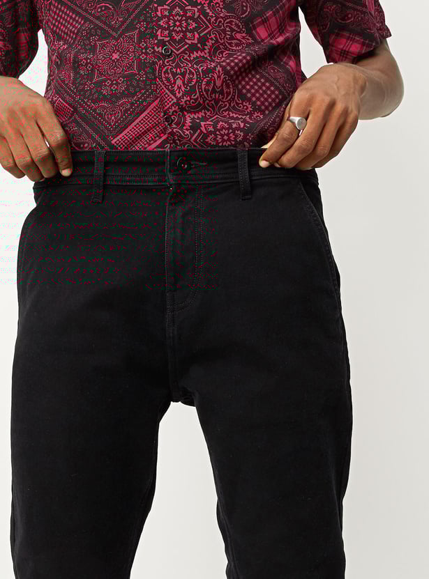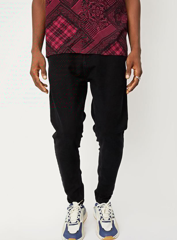An all-season favourite, this pair of jeans is cut in a carrot-fit profile and boasts a solid tone finish. It features a mid-rise waist, belt loops, cross pockets, back patch pockets, and a full-length profile. Team up this pair with a shirt and sneakers for a cool, off-duty look.