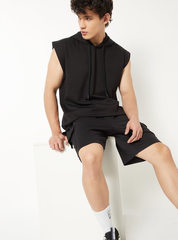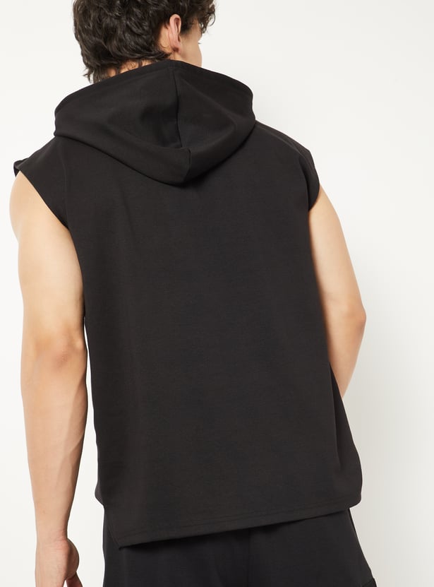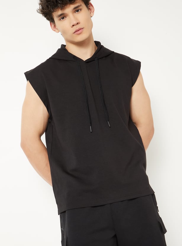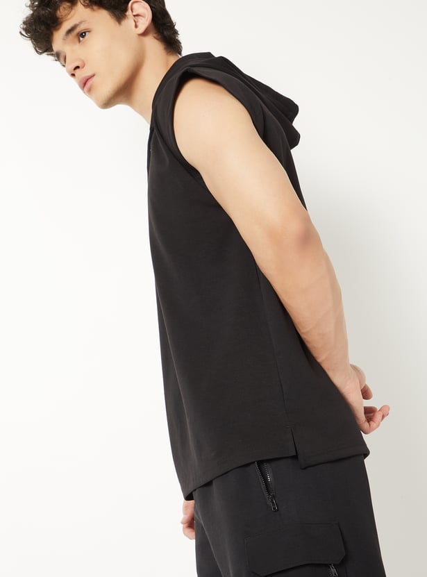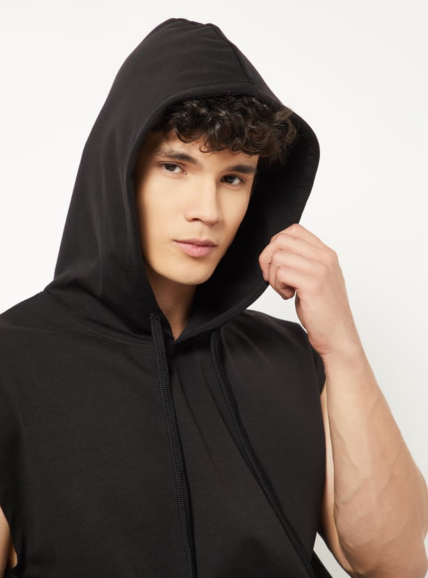 Designed for performance and ease, this solid hooded oversized sports T-shirt features a sleeveless cut for maximum mobility and breathability.