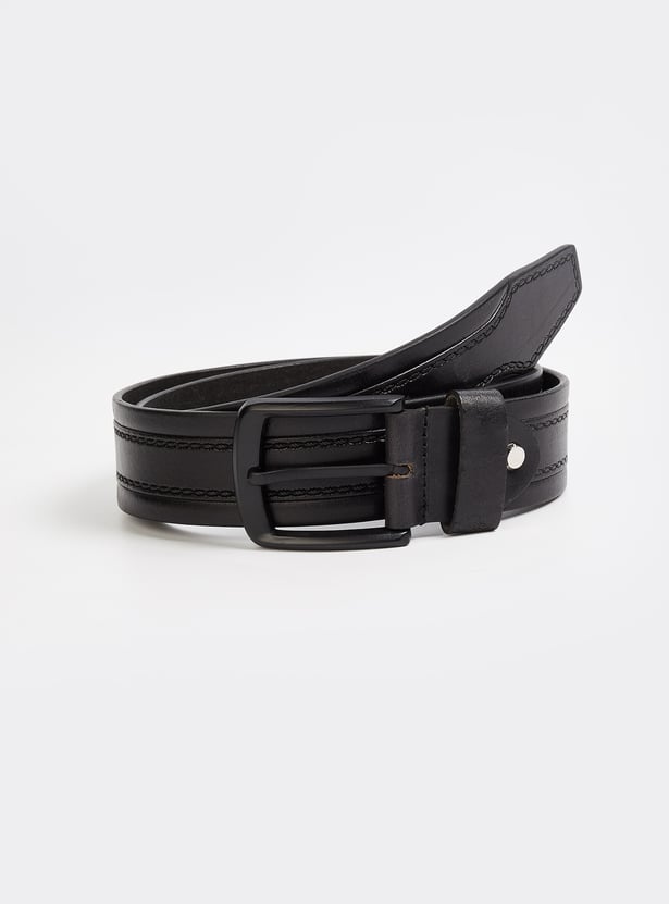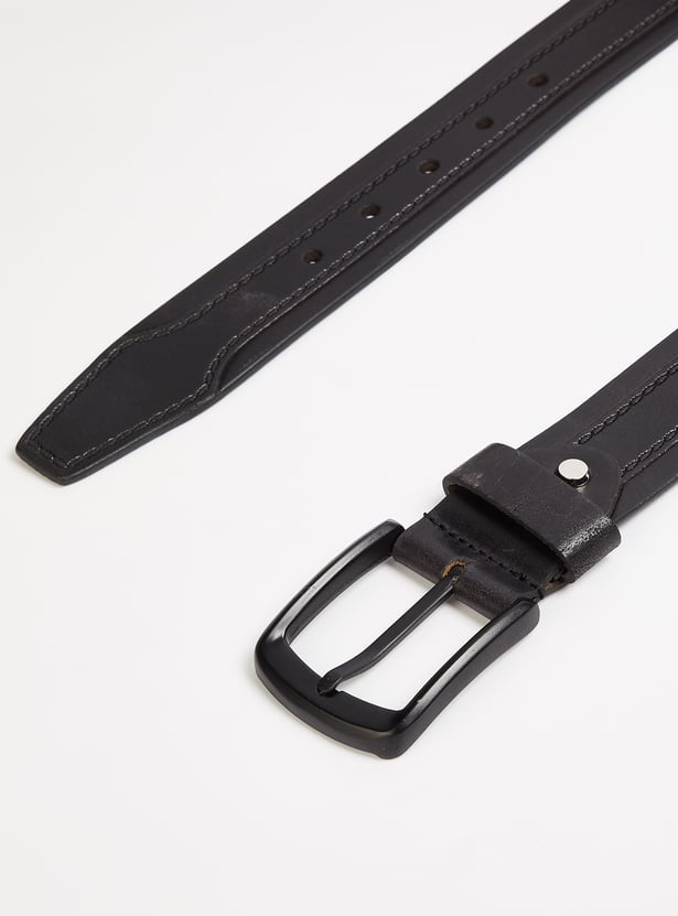 Designed with a solid surface, this leather belt features a metallic buckle, punch holes, and a belt loop. An ideal pick for an everyday wardrobe, this one scores well as a staple accessory.