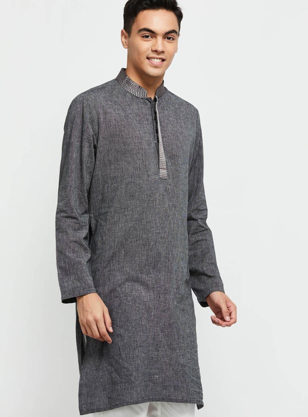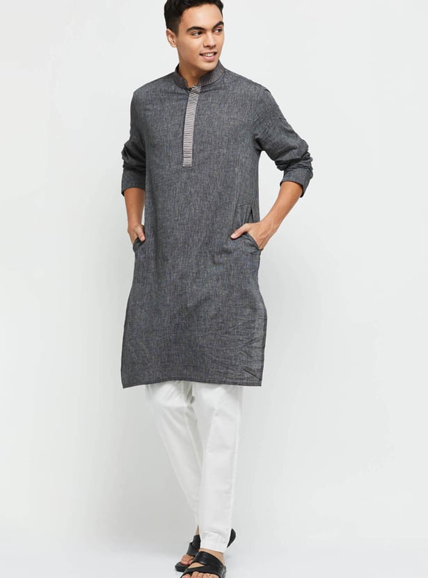 Add a fine ethnic touch in your style with this kurta, detailed with solid design, embroidered mandarin collar, full sleeves, and straight hemline.