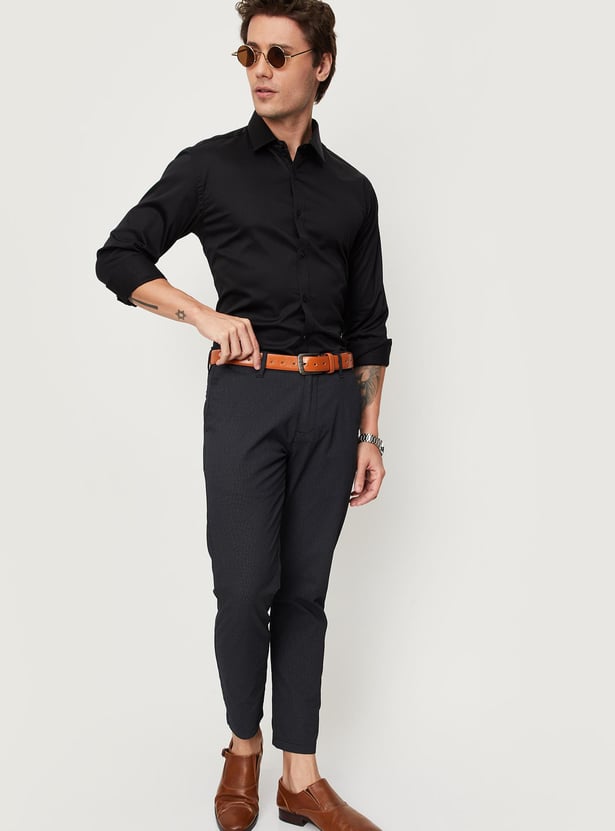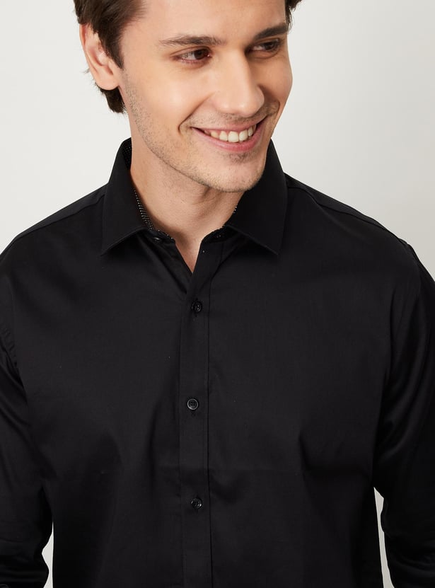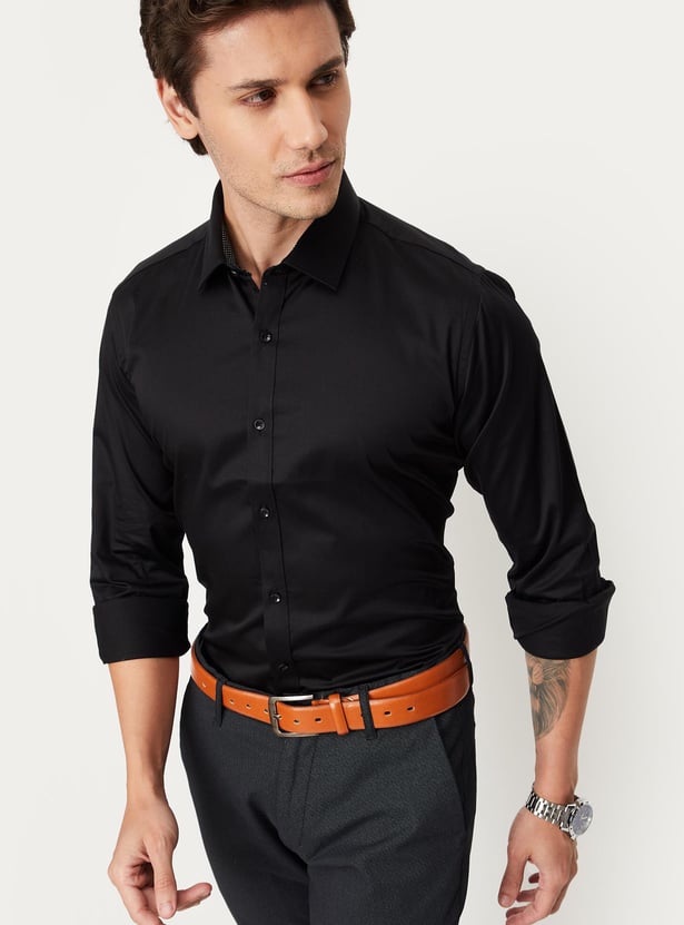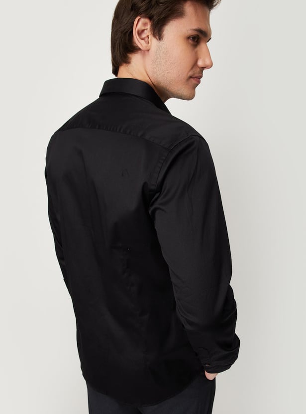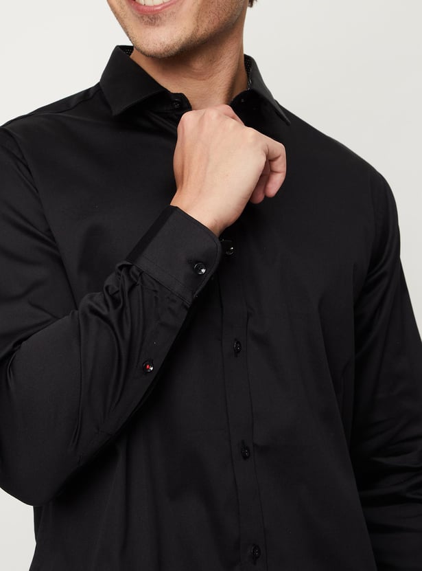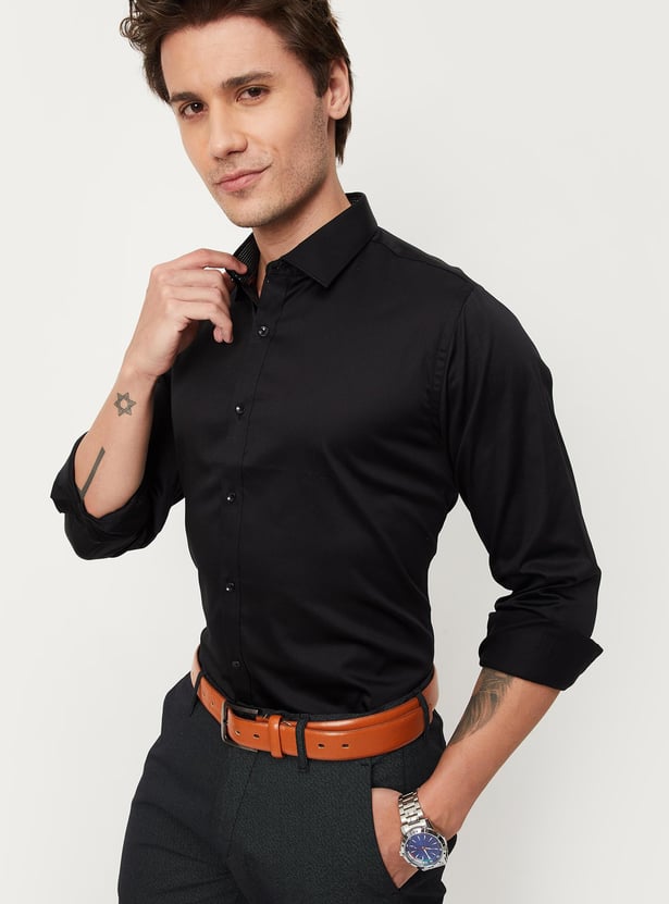 Dress up your outfit with this sateen shirt tailored in a slim fit profile. It features a spread collar, long sleeves, buttoned cuffs, and a curved hem. Pair this shirt with formal trousers and lace-ups for a refined look.