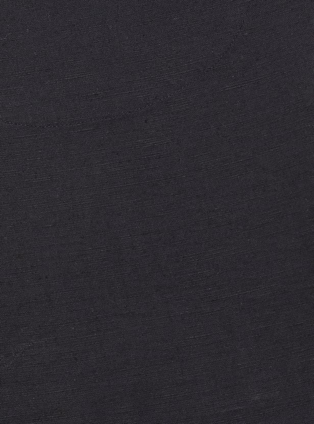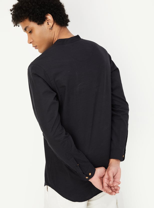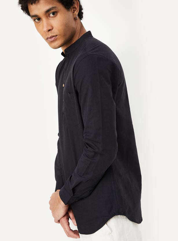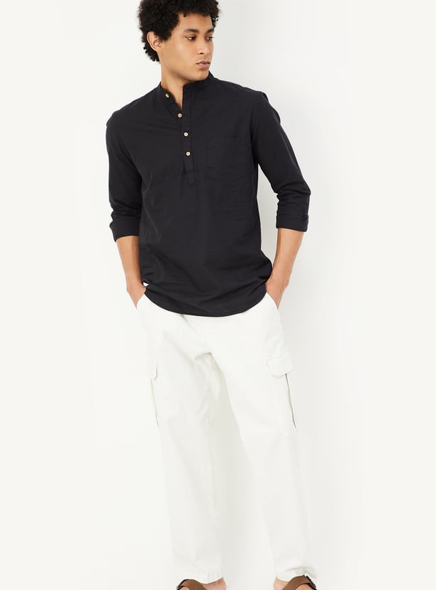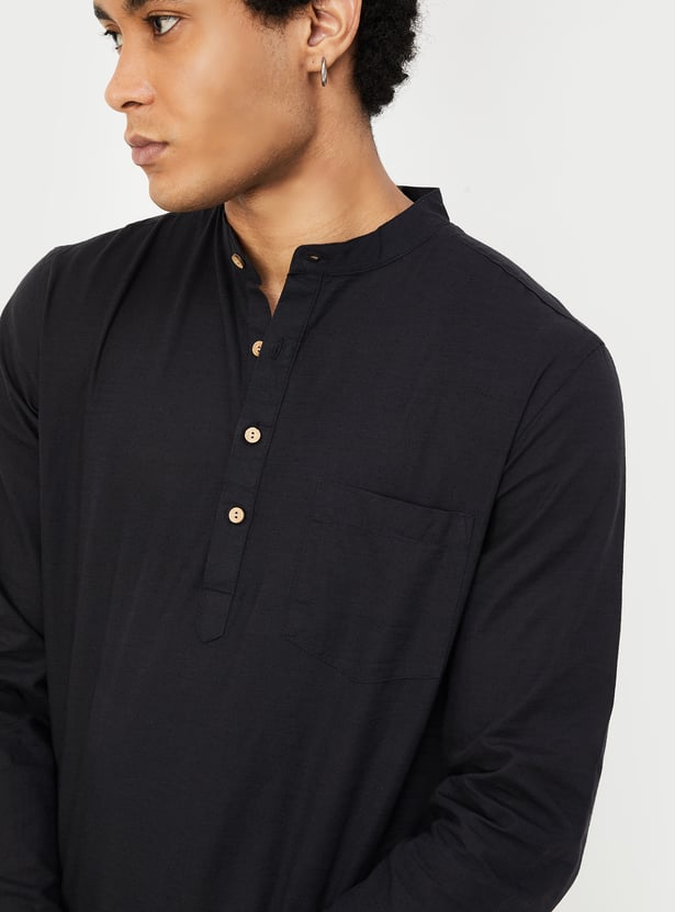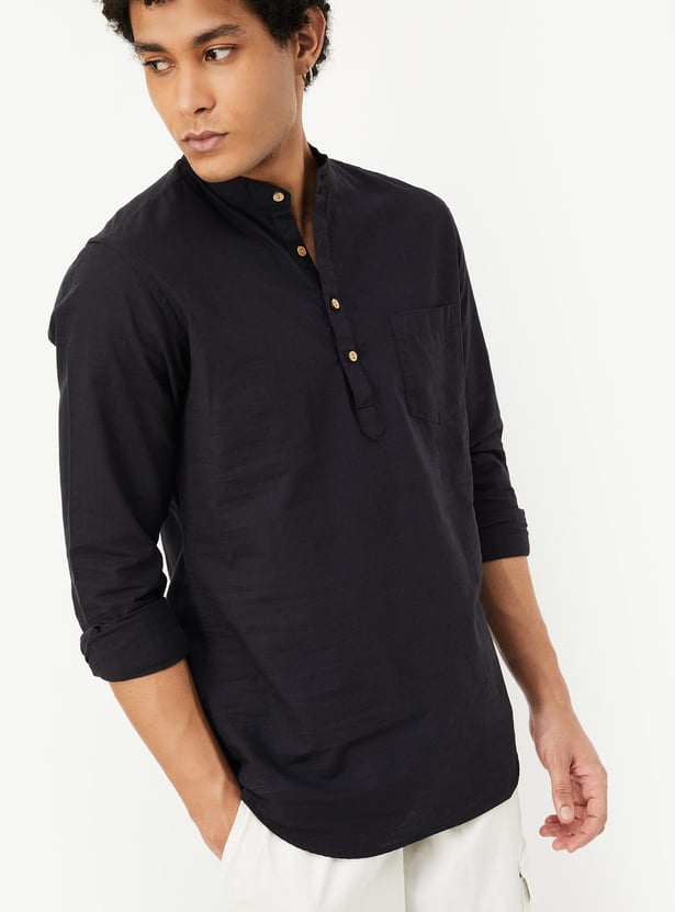 Update your ethnic wardrobe with this kurta. Designed in a solid tone, it is crafted in a short-length profile with a band collar, full sleeves, a button placket, a patch pocket and a curved hem.