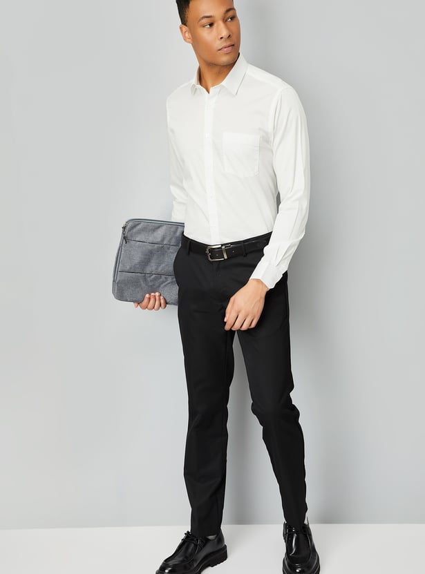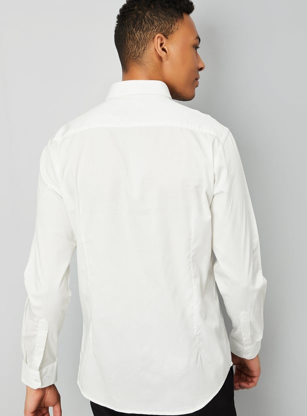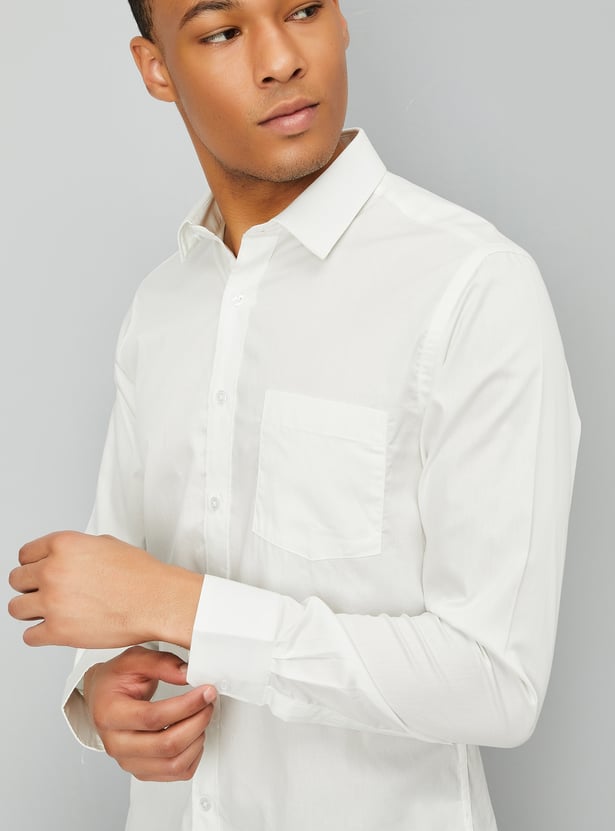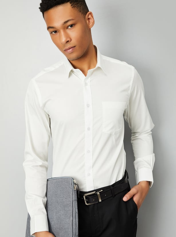Elevate your wardrobe with this solid slim fit shirt. Featuring a sharp spread collar, a stylish patch pocket, and a button placket, it offers a sleek and tailored look. The full sleeves with button cuffs complete the design, making it a versatile choice for both semi-formal and formal occasions.