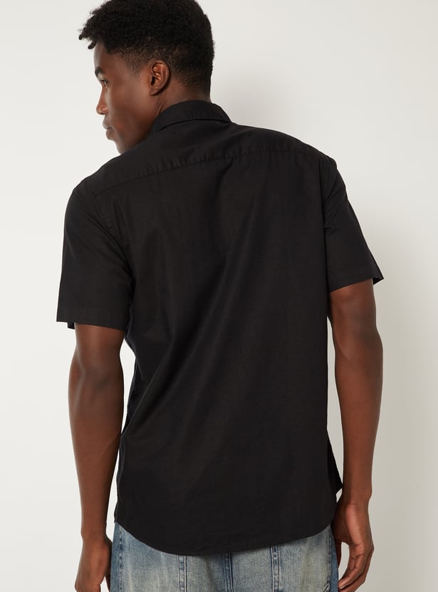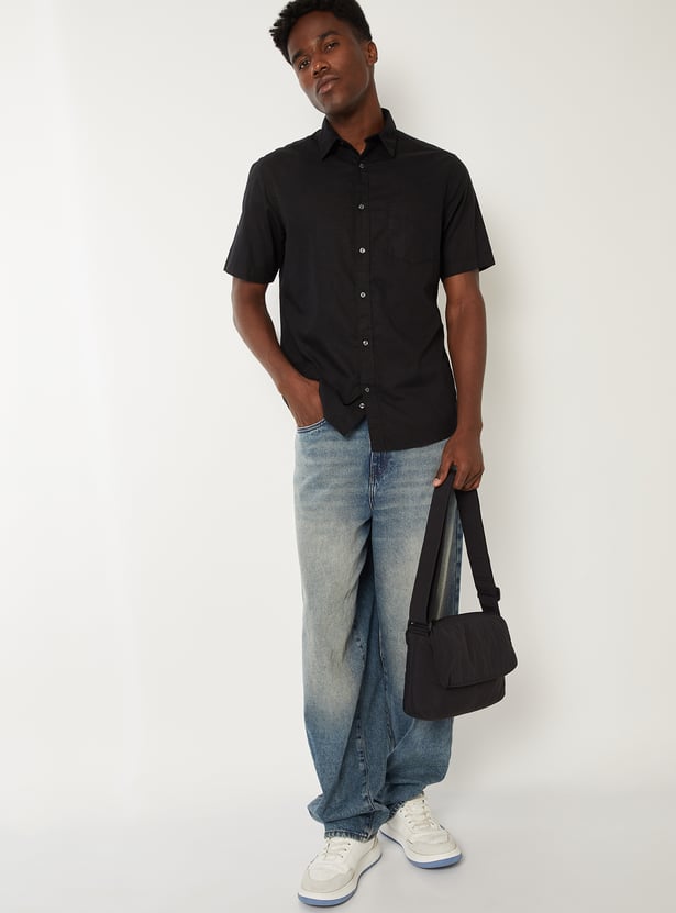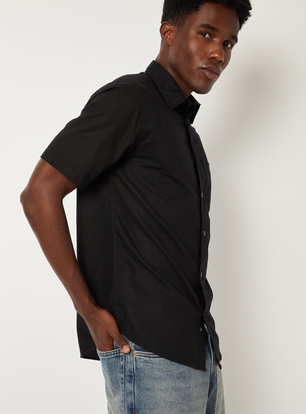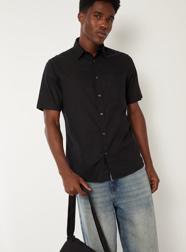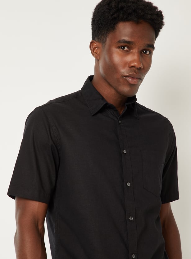 Keep it sharp and minimal with this solid slim fit shirt, featuring a clean spread collar, button placket, and a functional patch pocket. The half sleeves offer a relaxed feel, making it ideal for both work and casual settings.