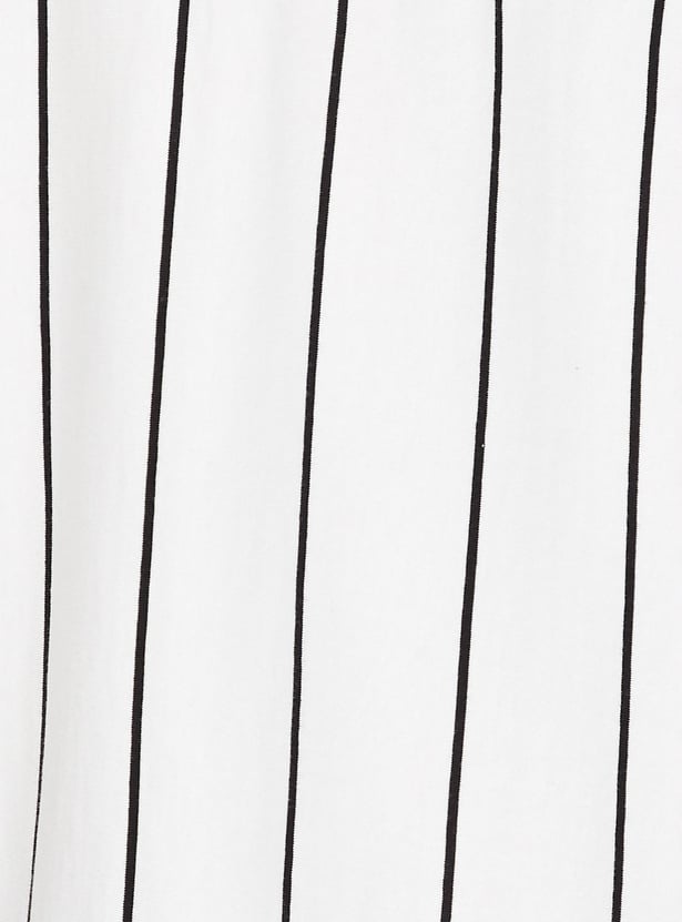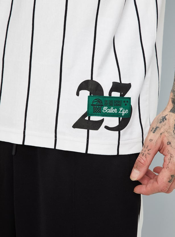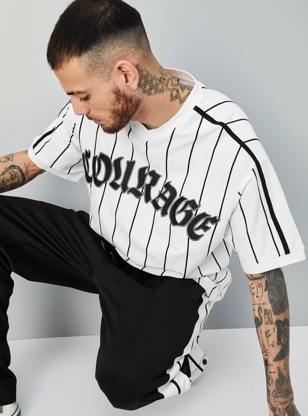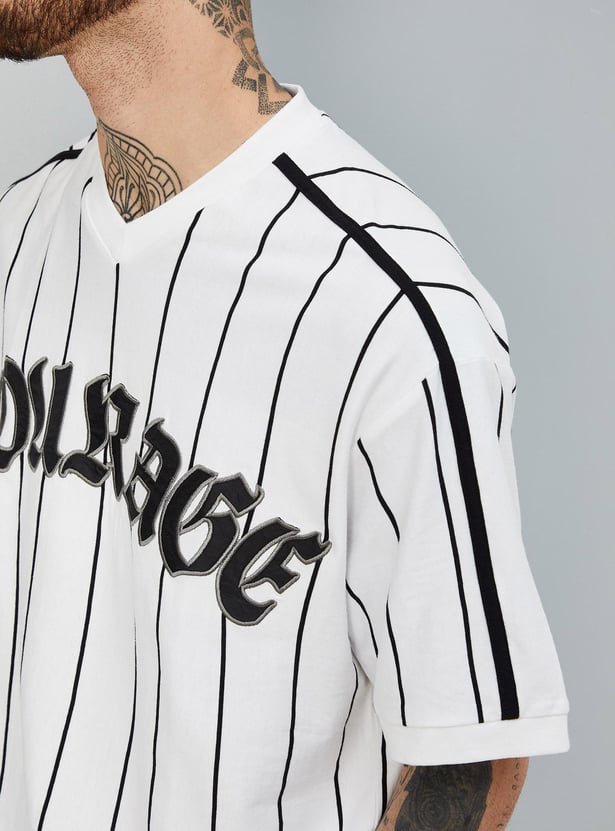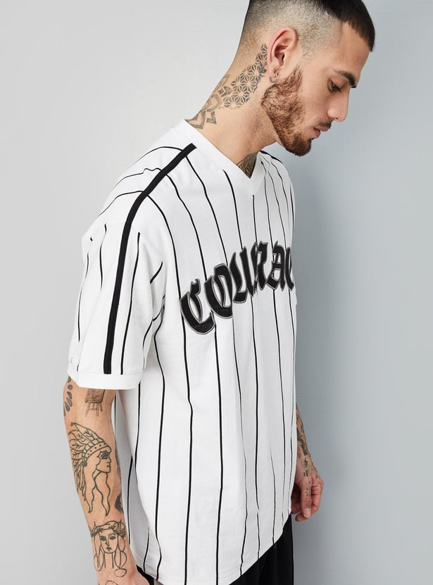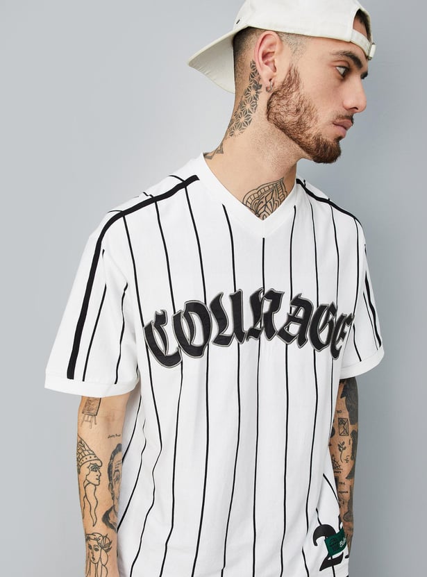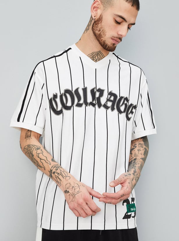 Perfect your sporty look with this T-shirt updated with a striped pattern. it has a V-neck, half sleeves, a typographic print at the chest, and an oversized profile.