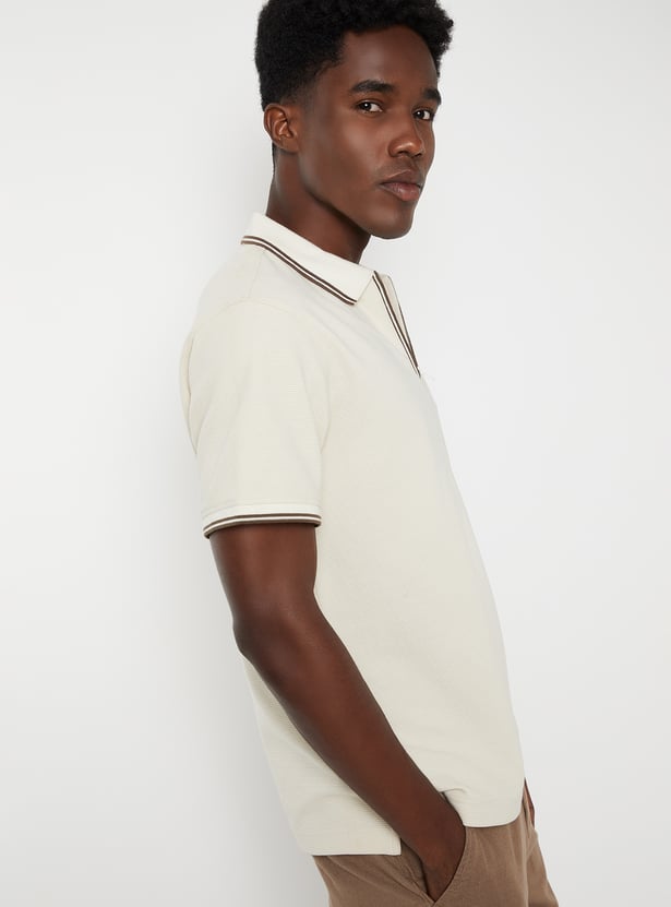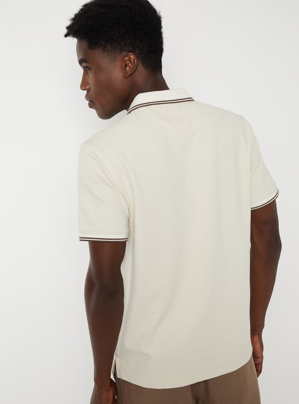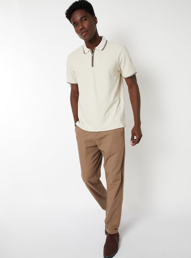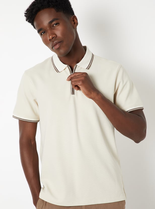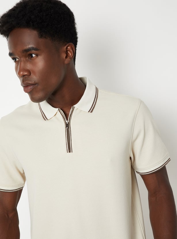Stay effortlessly stylish in this textured regular fit polo T-shirt, featuring a classic polo collar, zip closure, and half sleeves. Designed for comfort with a modern twist on a timeless look.