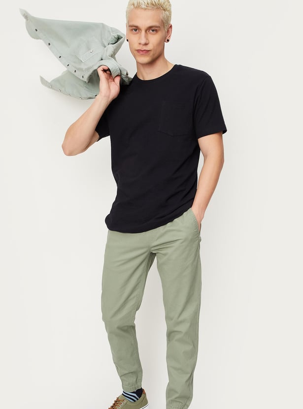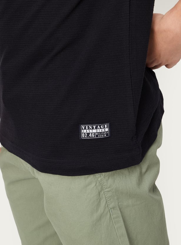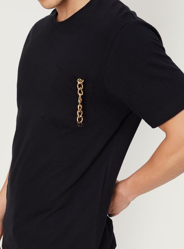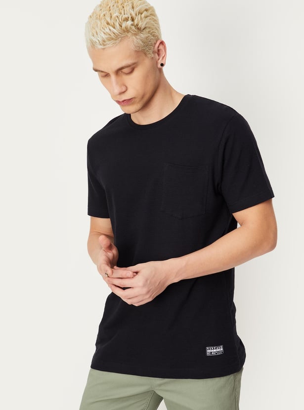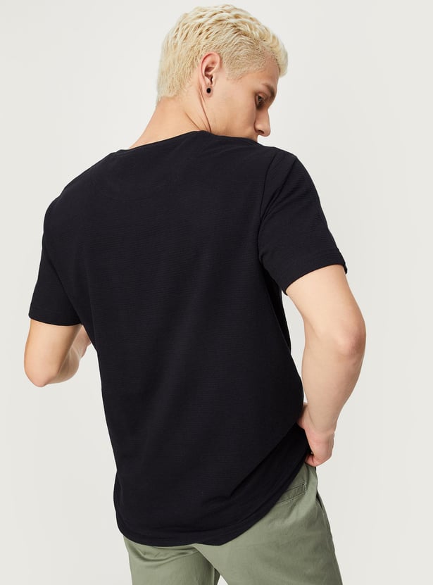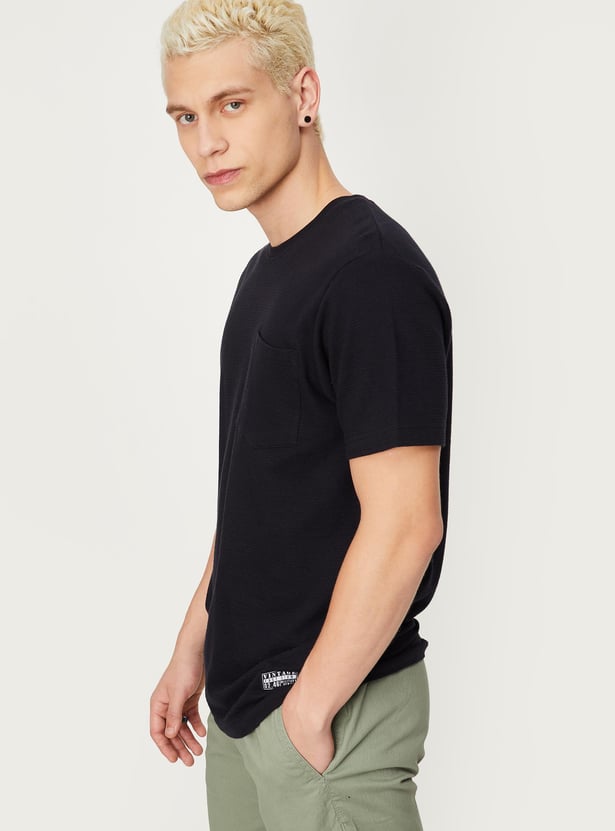 Up your style quotient with this textured T-shirt. This slim-fit profile features a crew neck, a patch pocket at the chest, and half sleeves. Team up this tee with a pair of jeans and sneakers to complete the look.